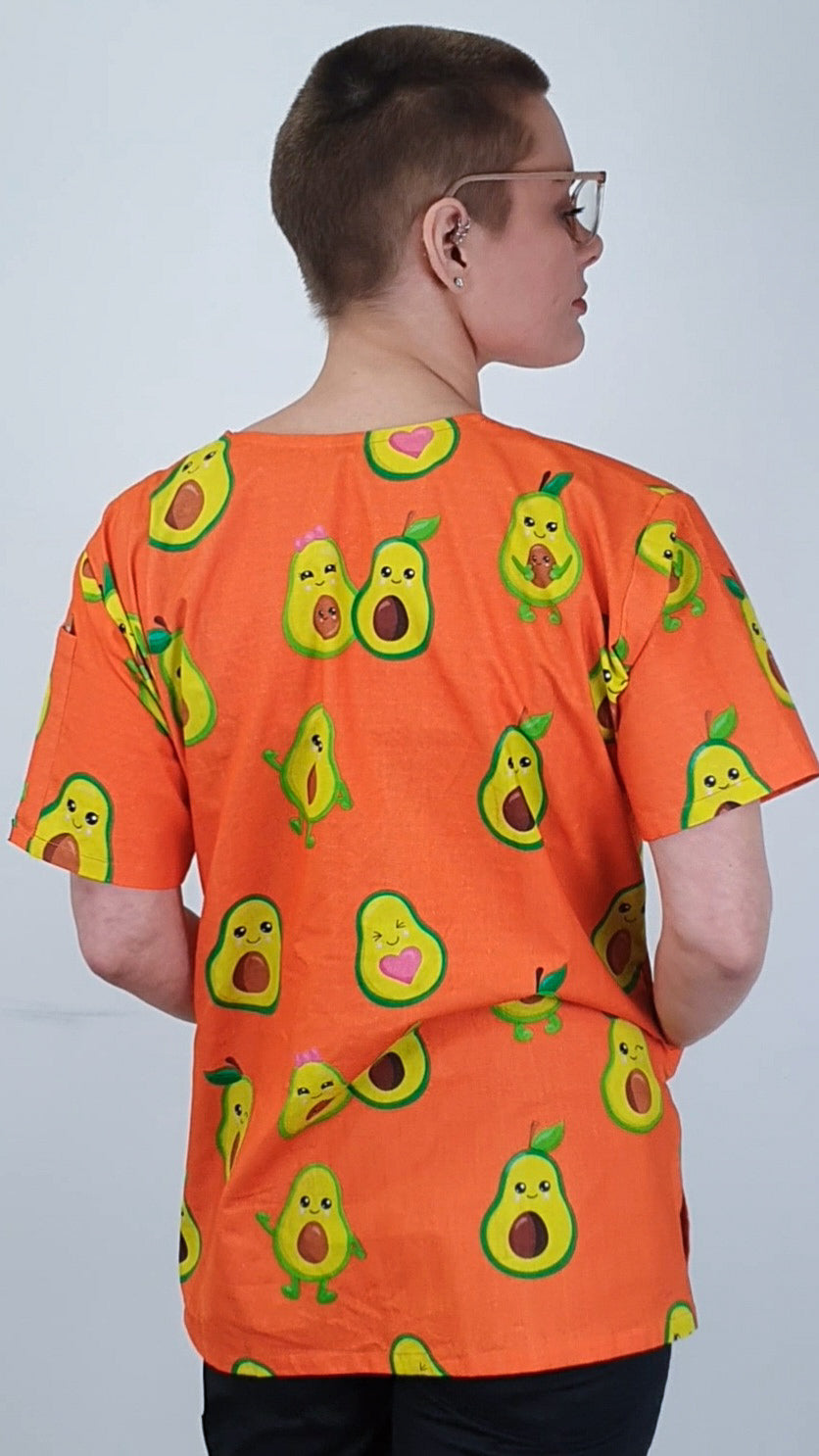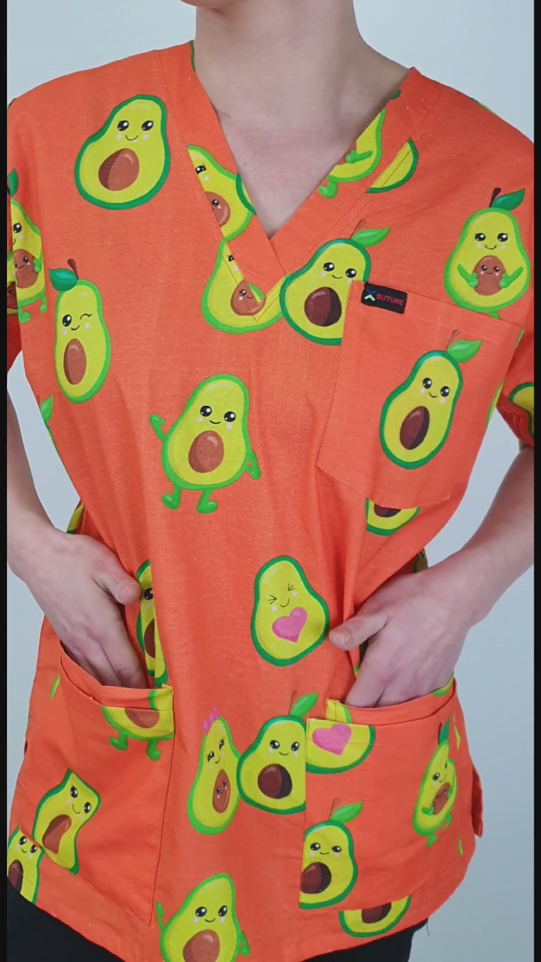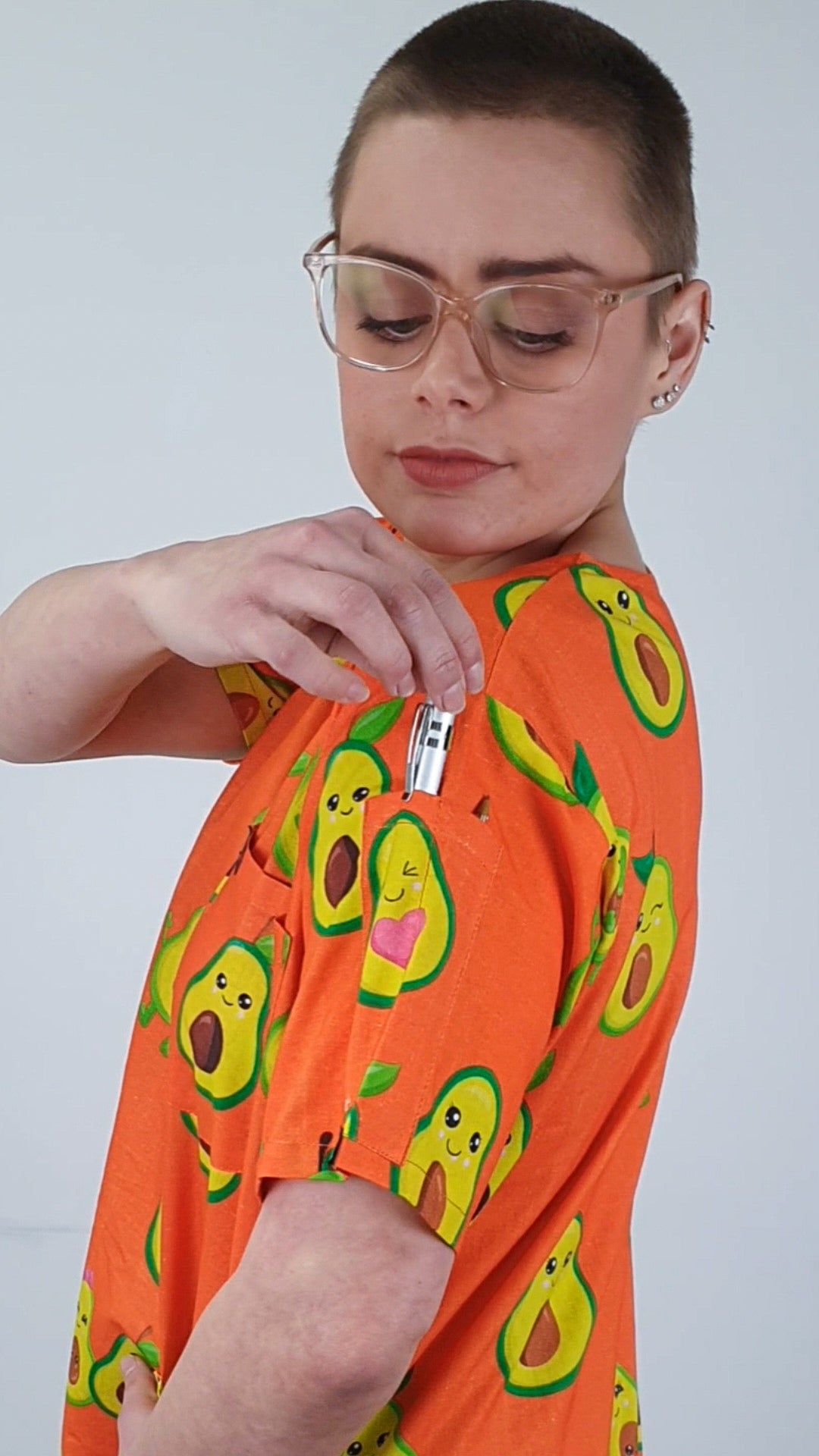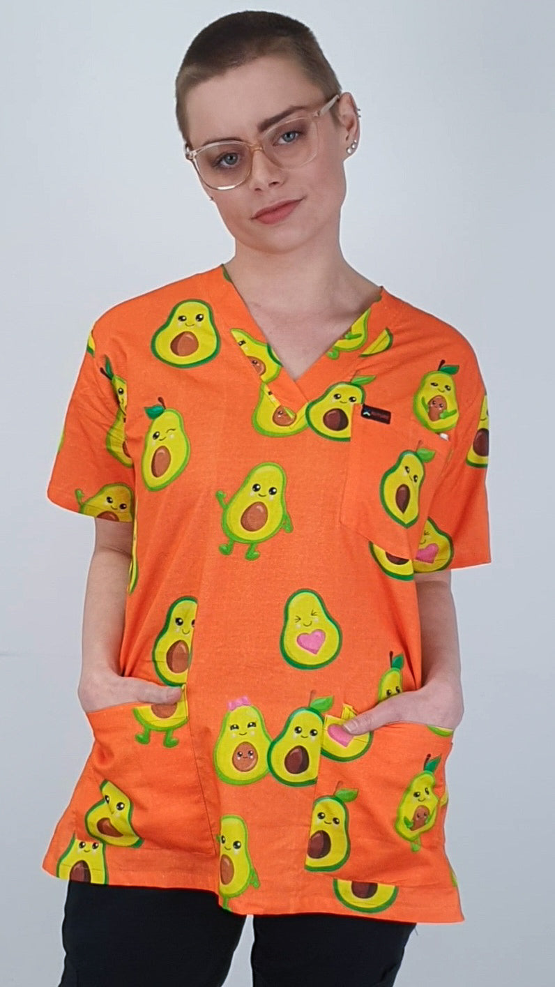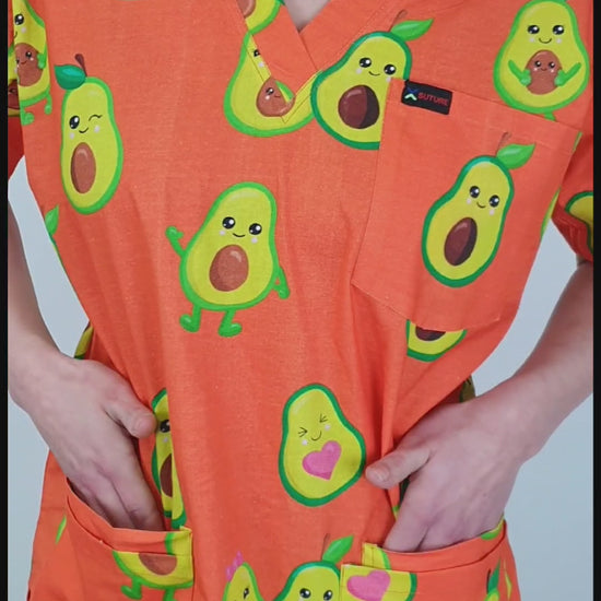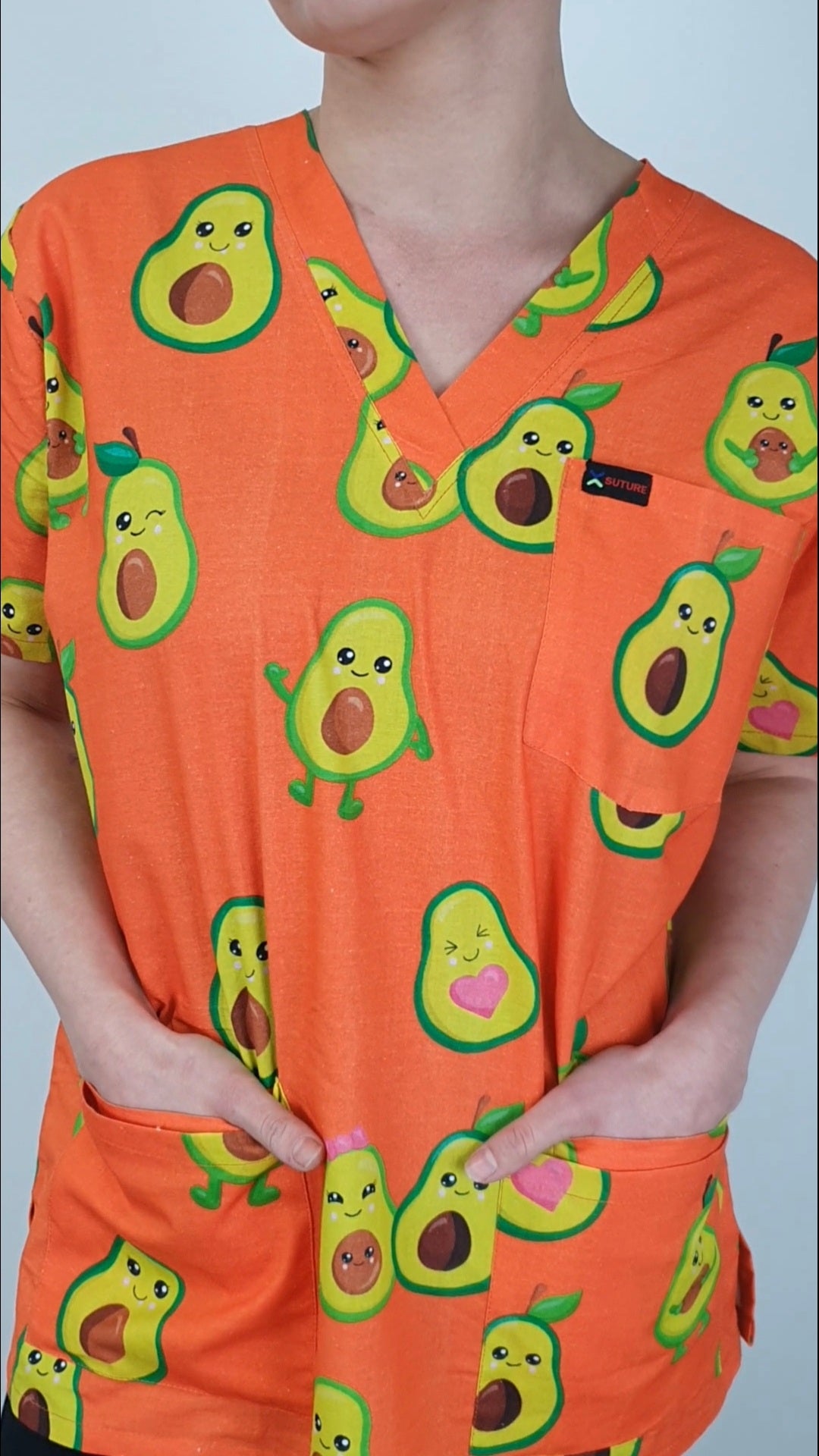 Cute Avocado print medical uniform fun Scrub Top featuring a contemporary fit v neck with side slits. This scrub top features 1 chest pocket and 2 lower hip patch pocket with internal compartment pockets to store all of your essentials .The top also has 2 Pen Pockets on Left Sleeve. The Fabric is 100% Cotton .Print placement may vary per individual garment.