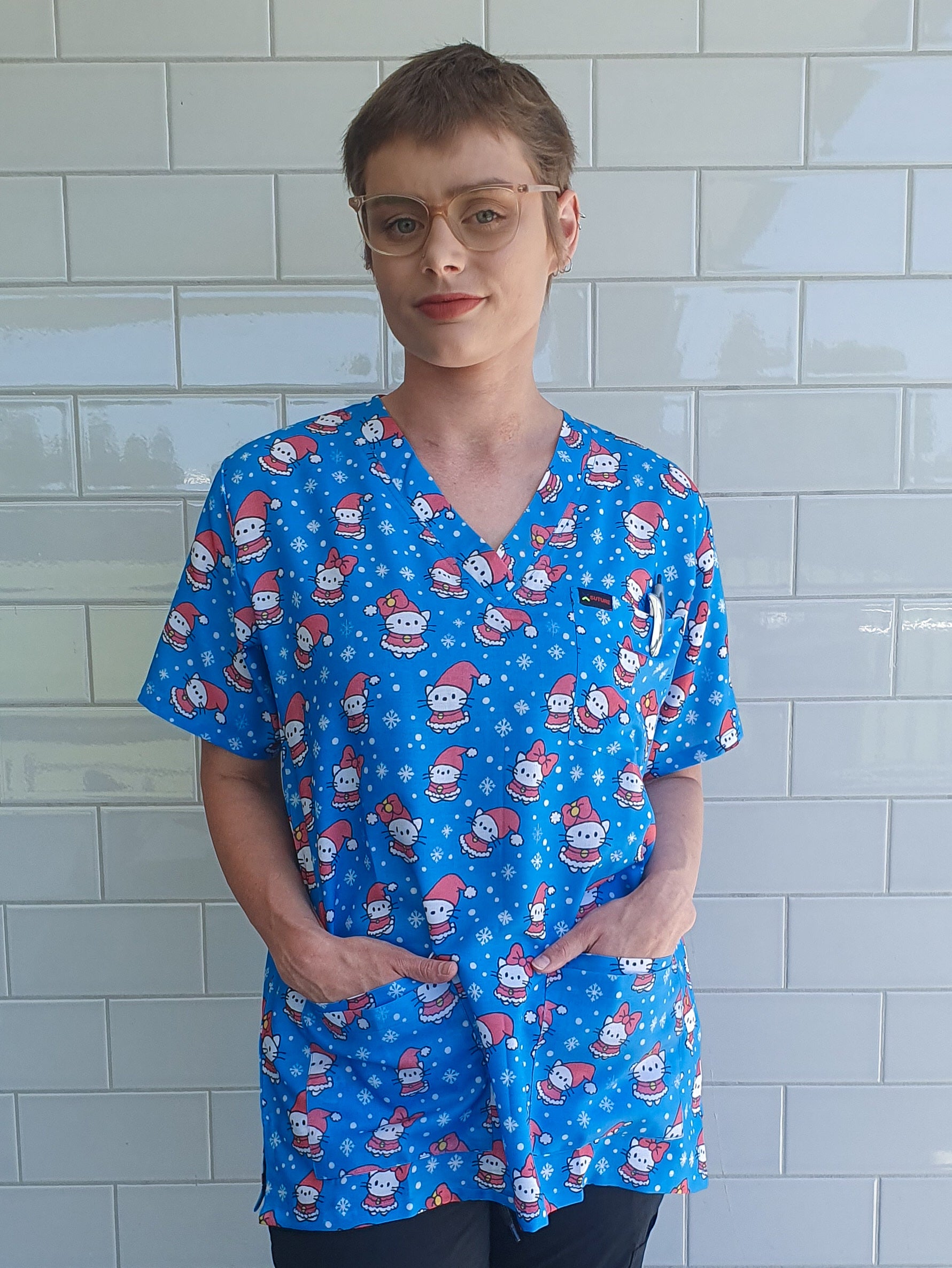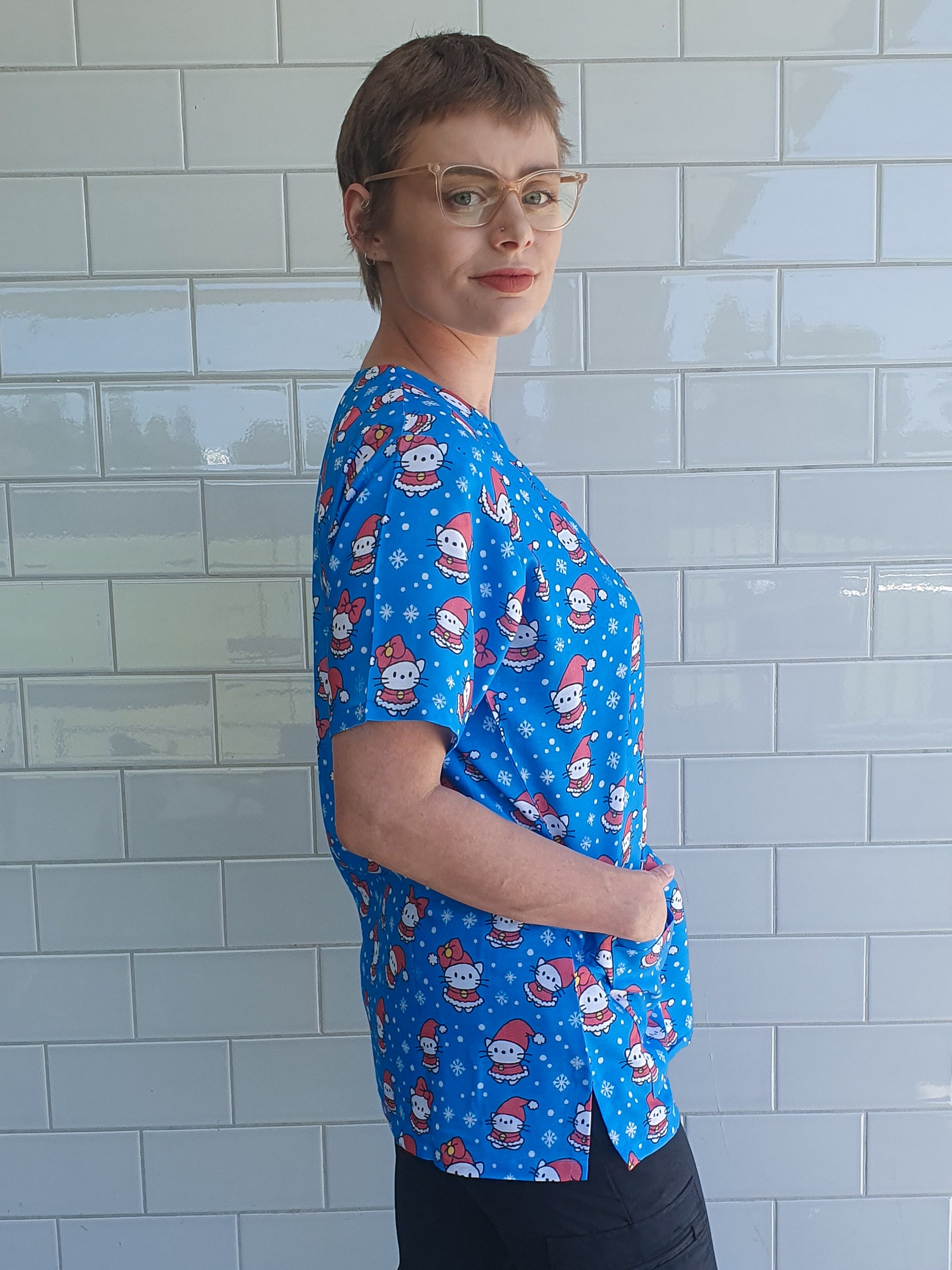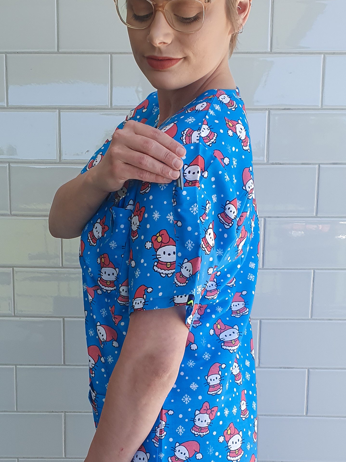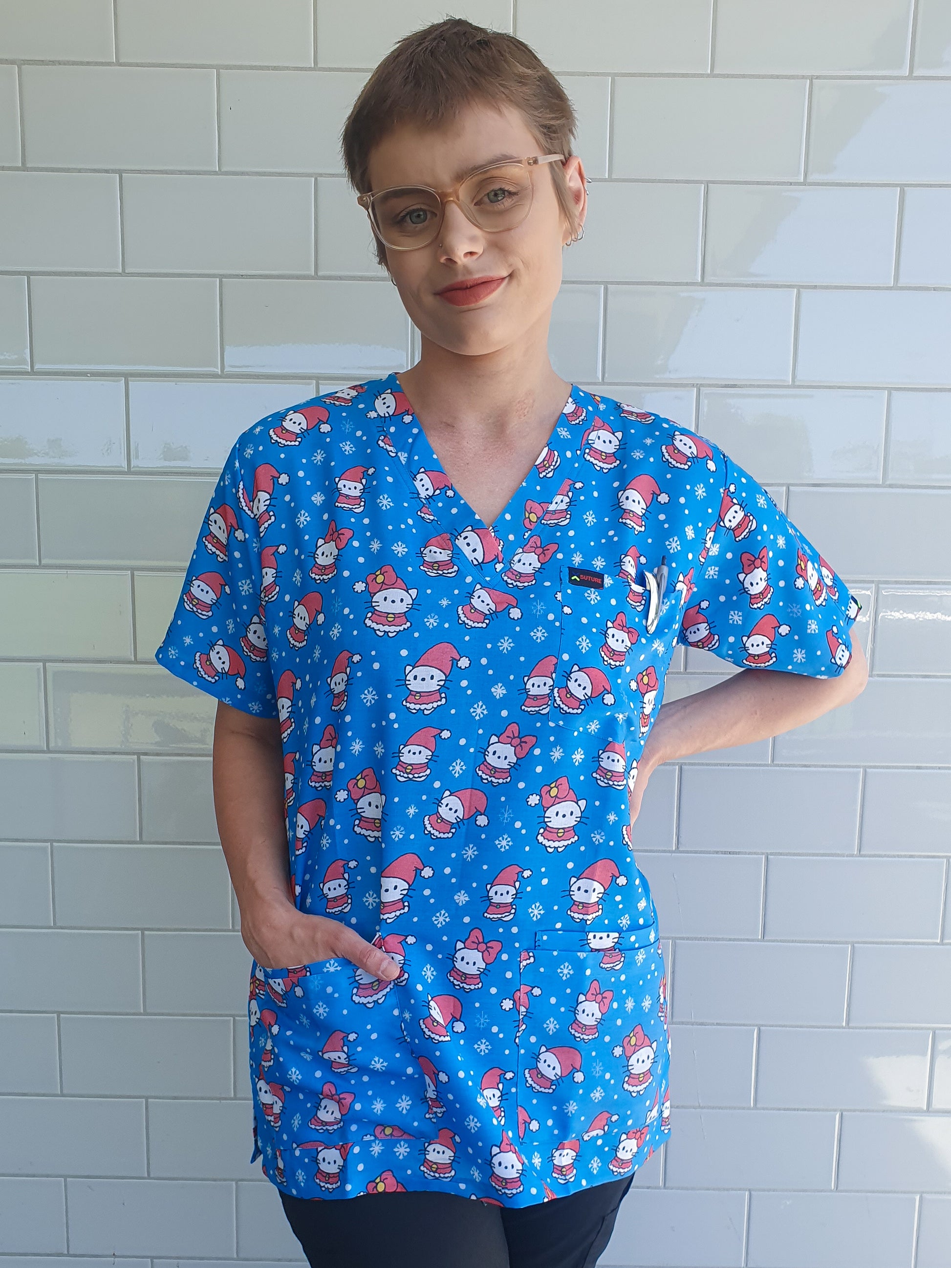 Blue Kitten Christmas Printed Fun Scrub Top Australia