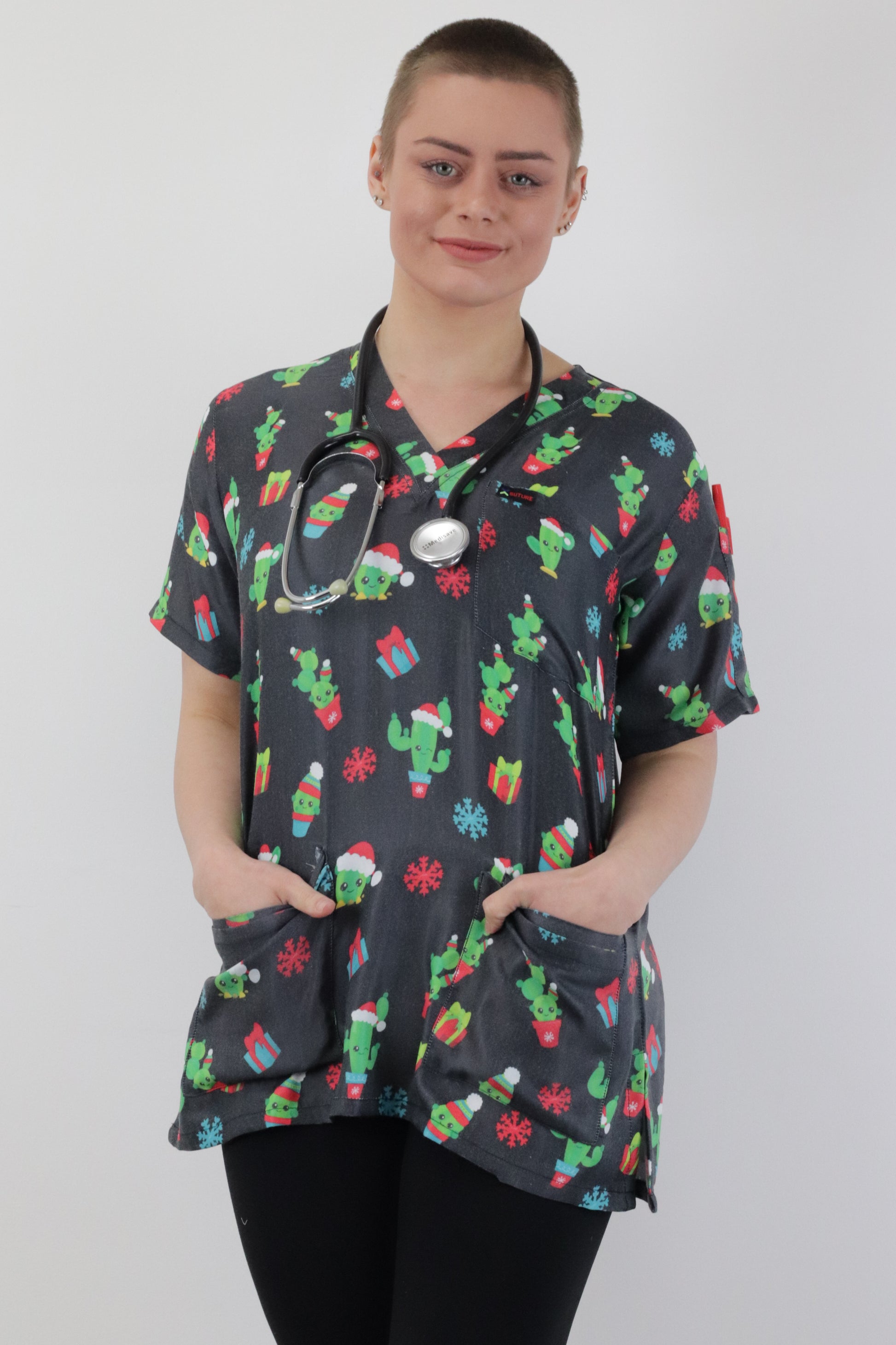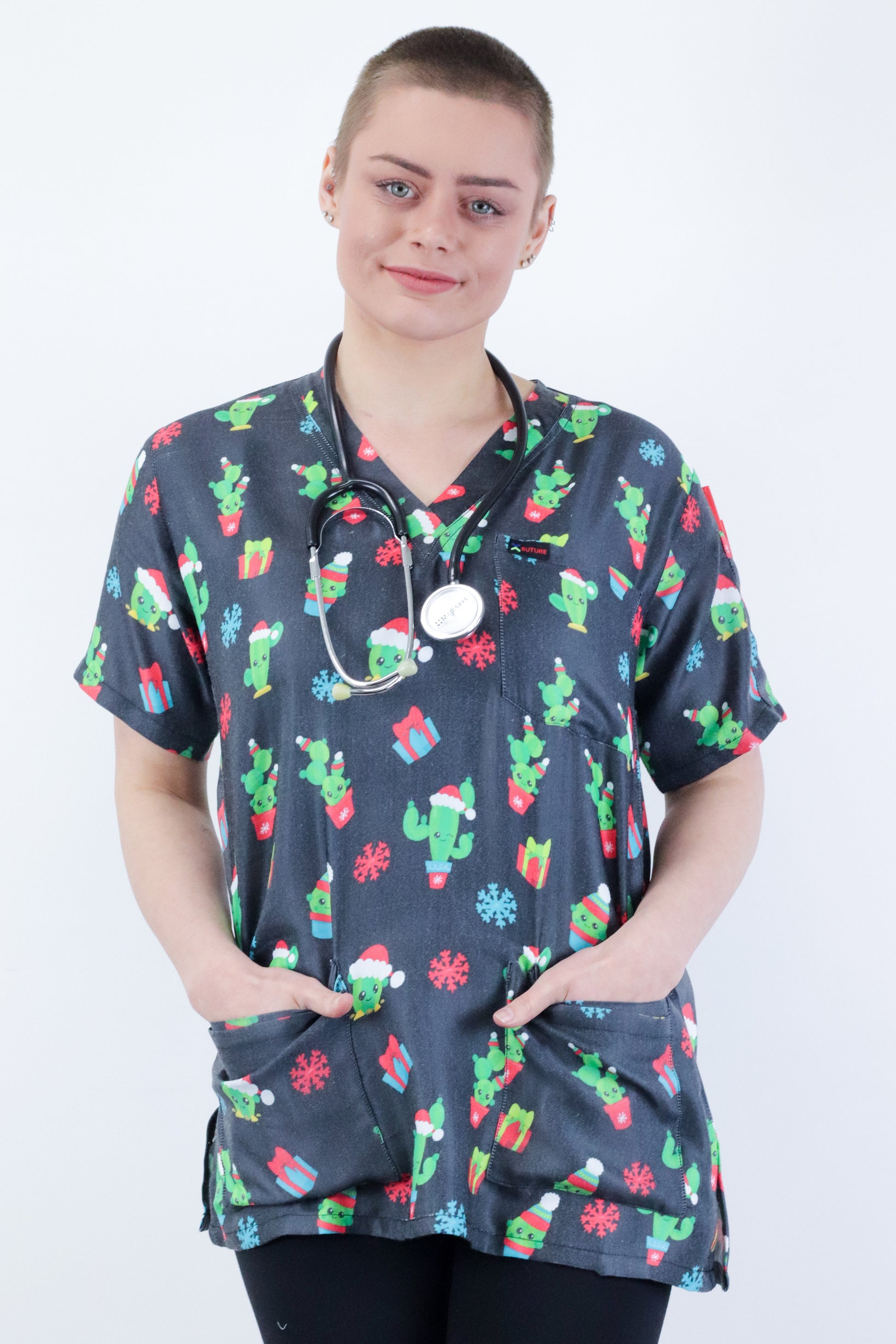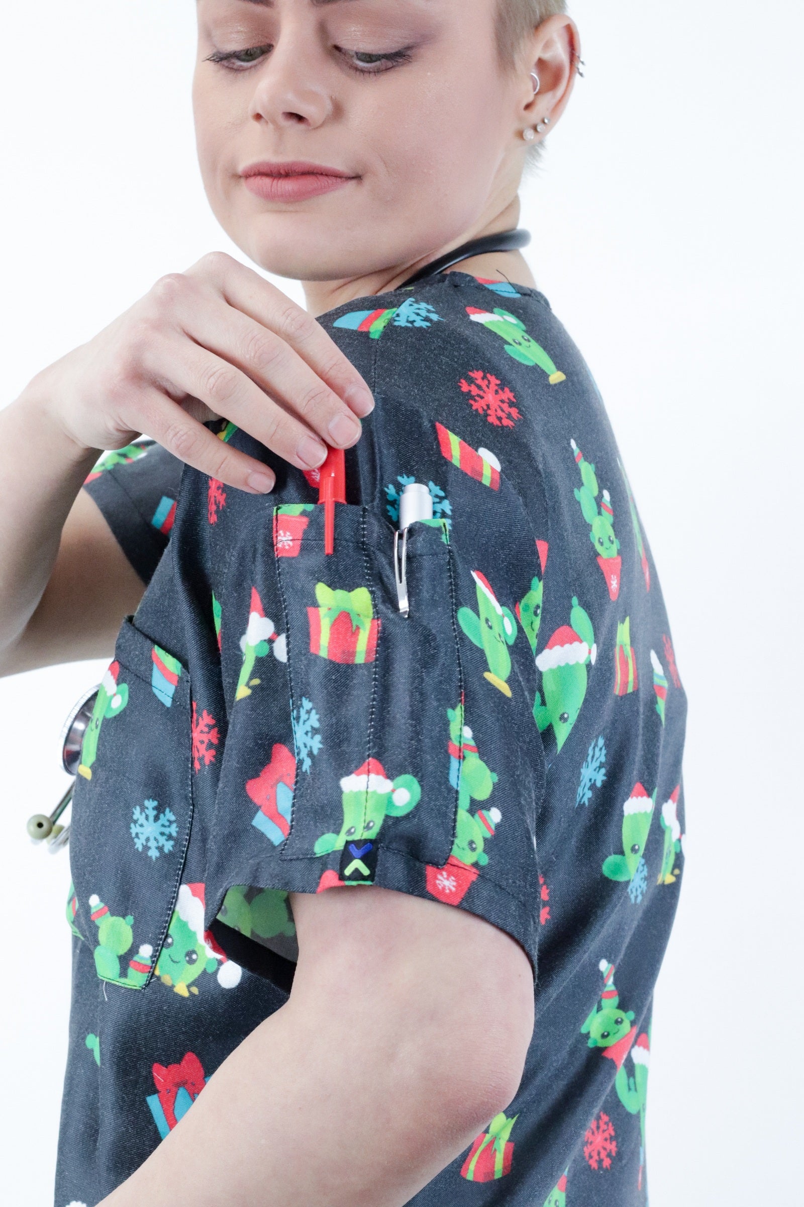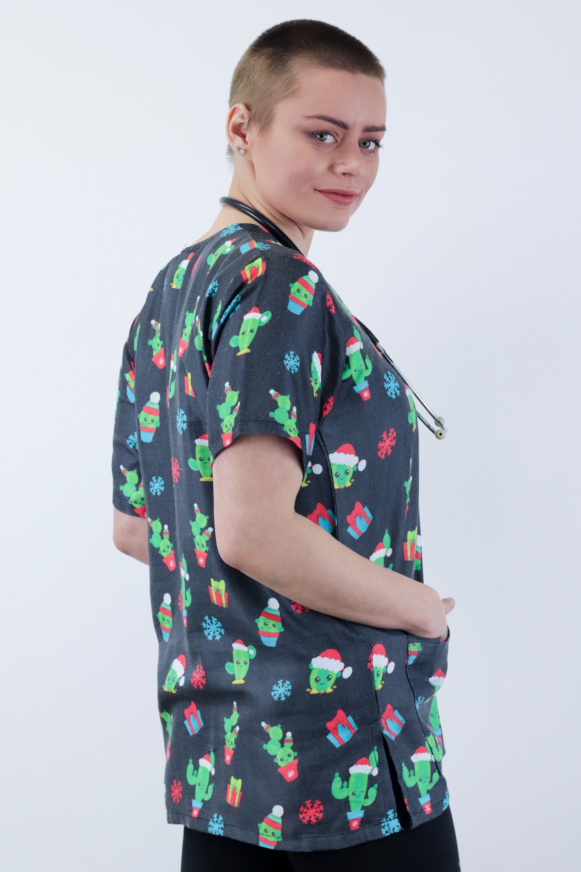 Cactus printed Christmas medical uniform fun Scrub Top featuring a contemporary fit v neck with side slits. The scrub top features 1 chest pocket and 2 lower hip patch pocket with internal compartment pockets to store all of your essentials .The top also has 2 Pen Pockets on Left Sleeve. This scrub is made of High Quality ,Soft, light weight polyester cotton ,giving throughout the year comfort.