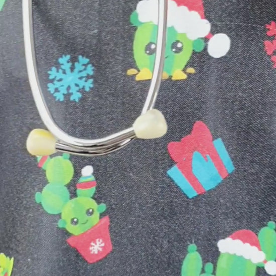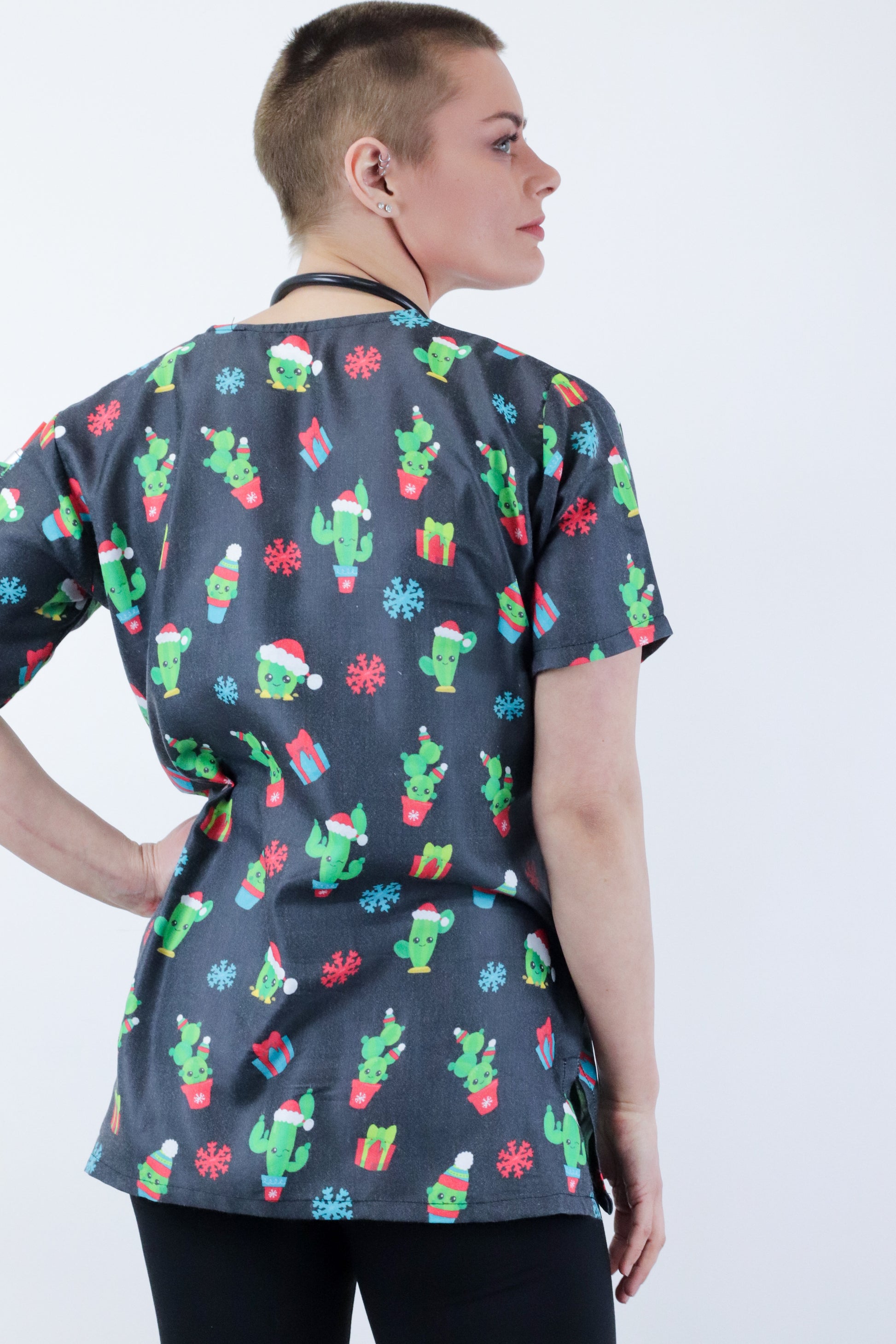 A perfect christmas scrub top to uplift the spirit , joy and fun of christmas featuringCute Cactus with christmas hat and git
