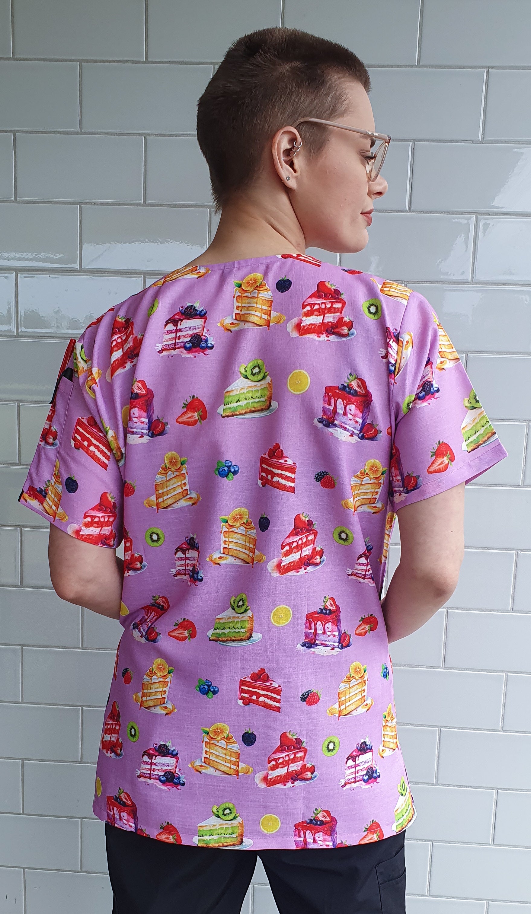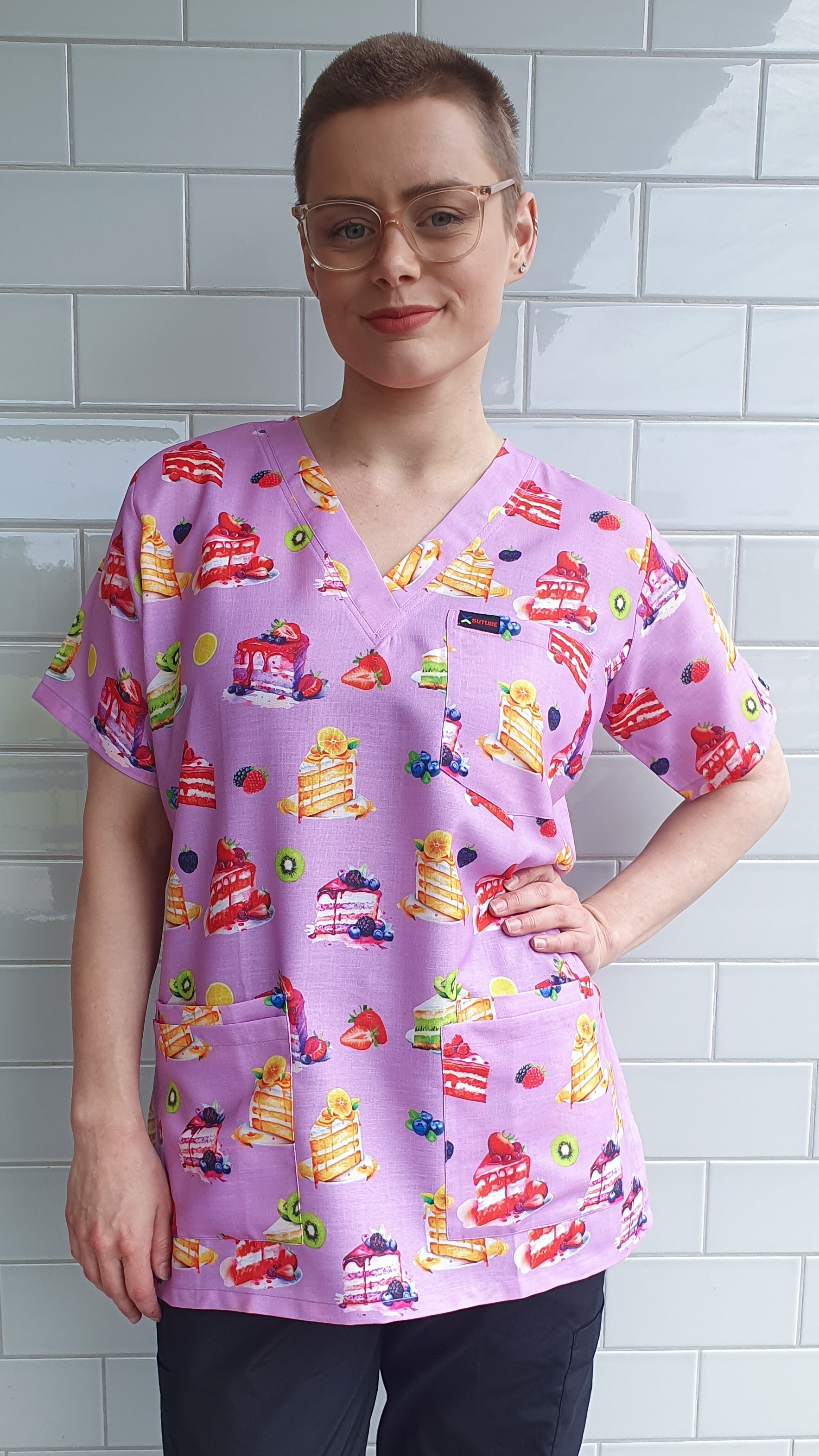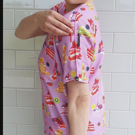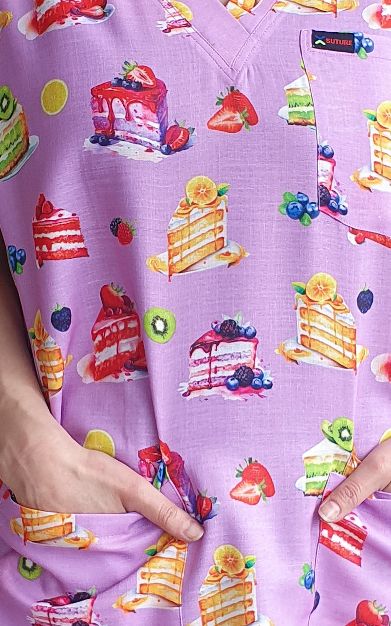 Sweet Cake Slice With Fruits Printed V-Neck Printed Scrub Top featuring a contemporary fit v neck with side slits. The scrub top features 1 chest pocket and 2 lower hip patch pocket with internal compartment pockets to store all of your essentials .The top also has 2 Pen Pockets on Left Sleeve. This scrub is made of High Quality ,Soft, light weight polyester cotton ,giving throughout the year comfort.