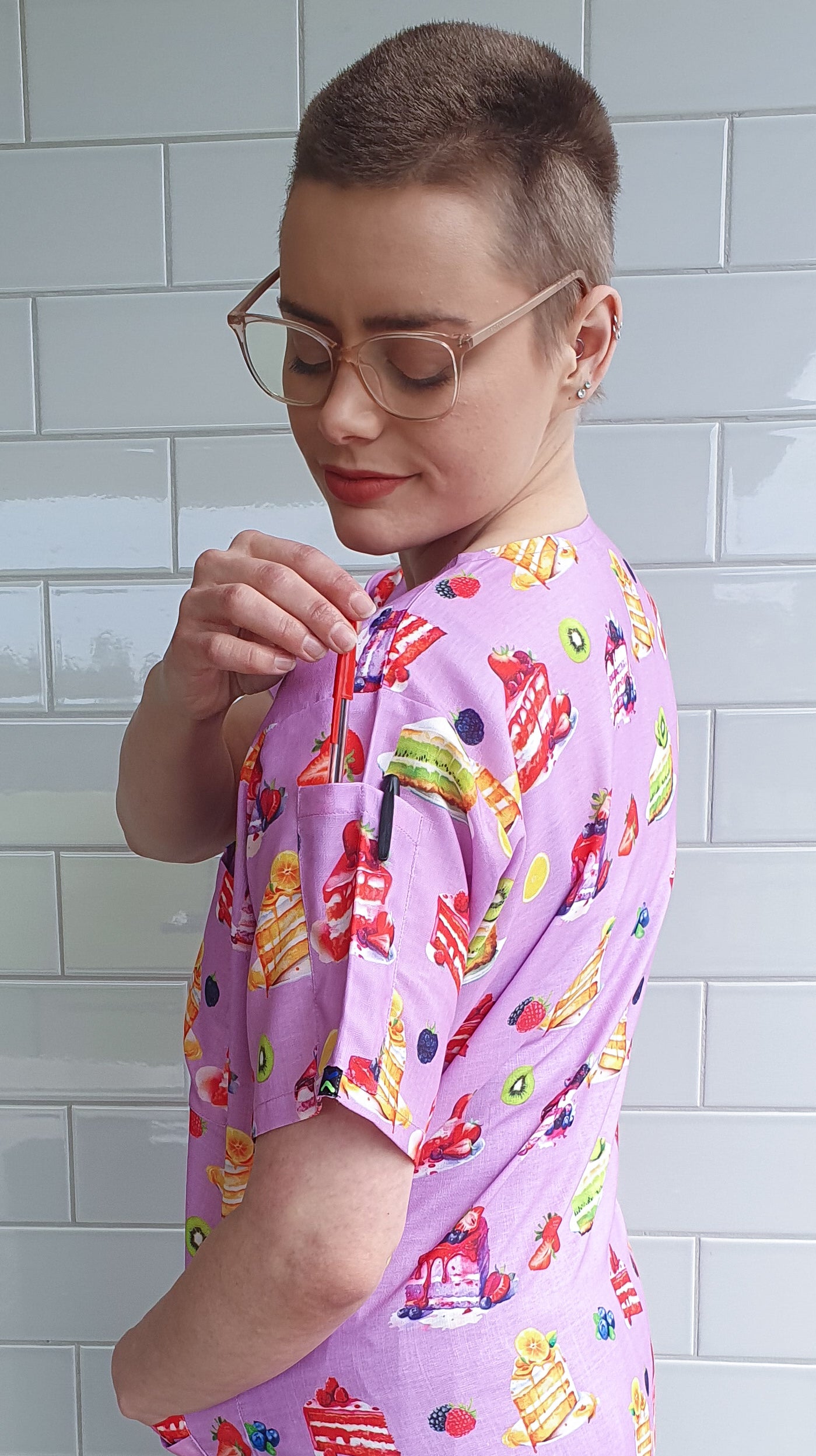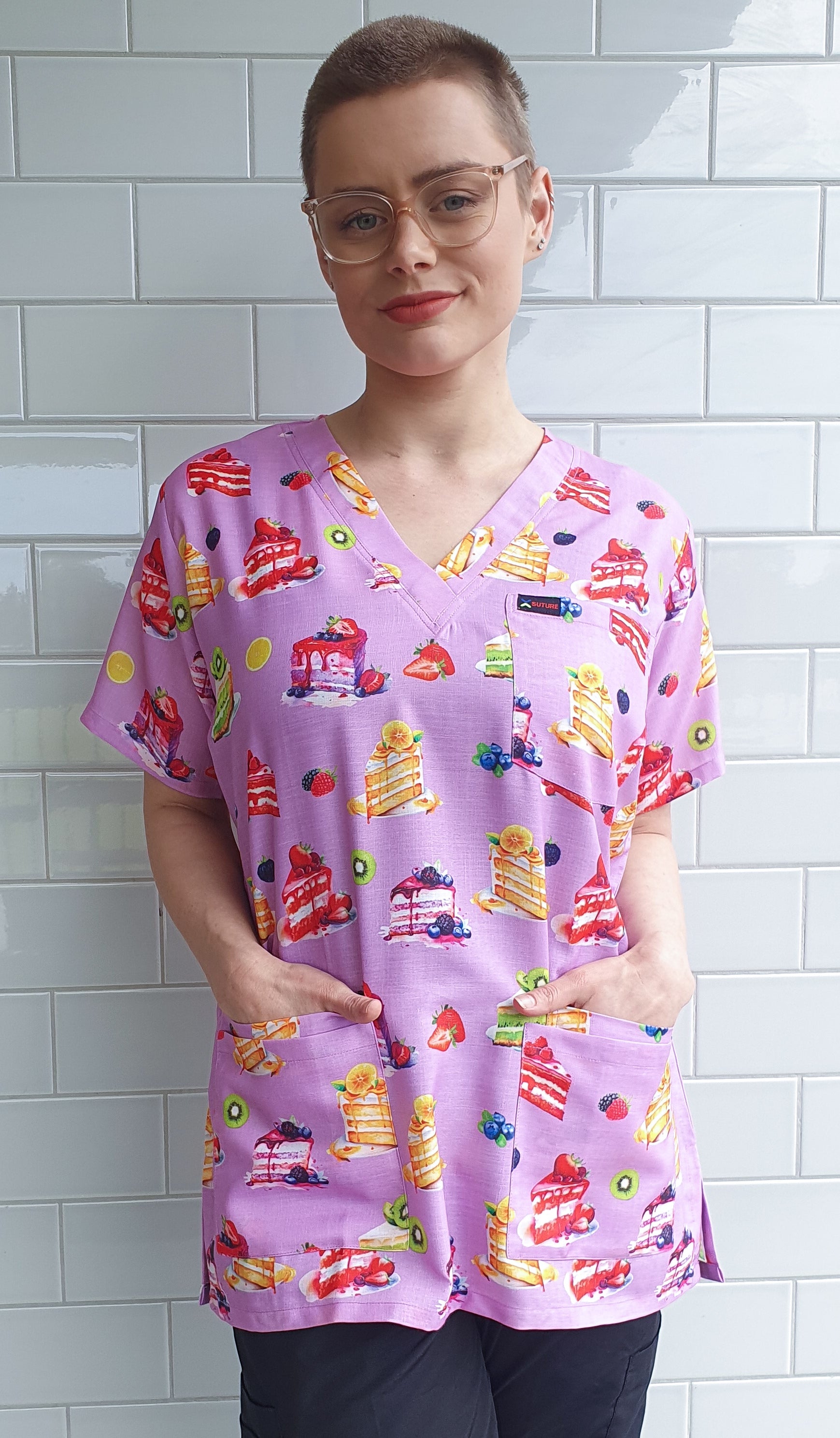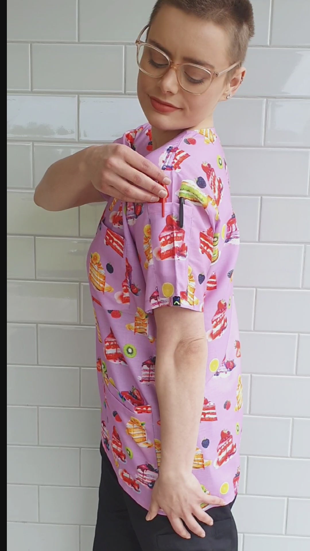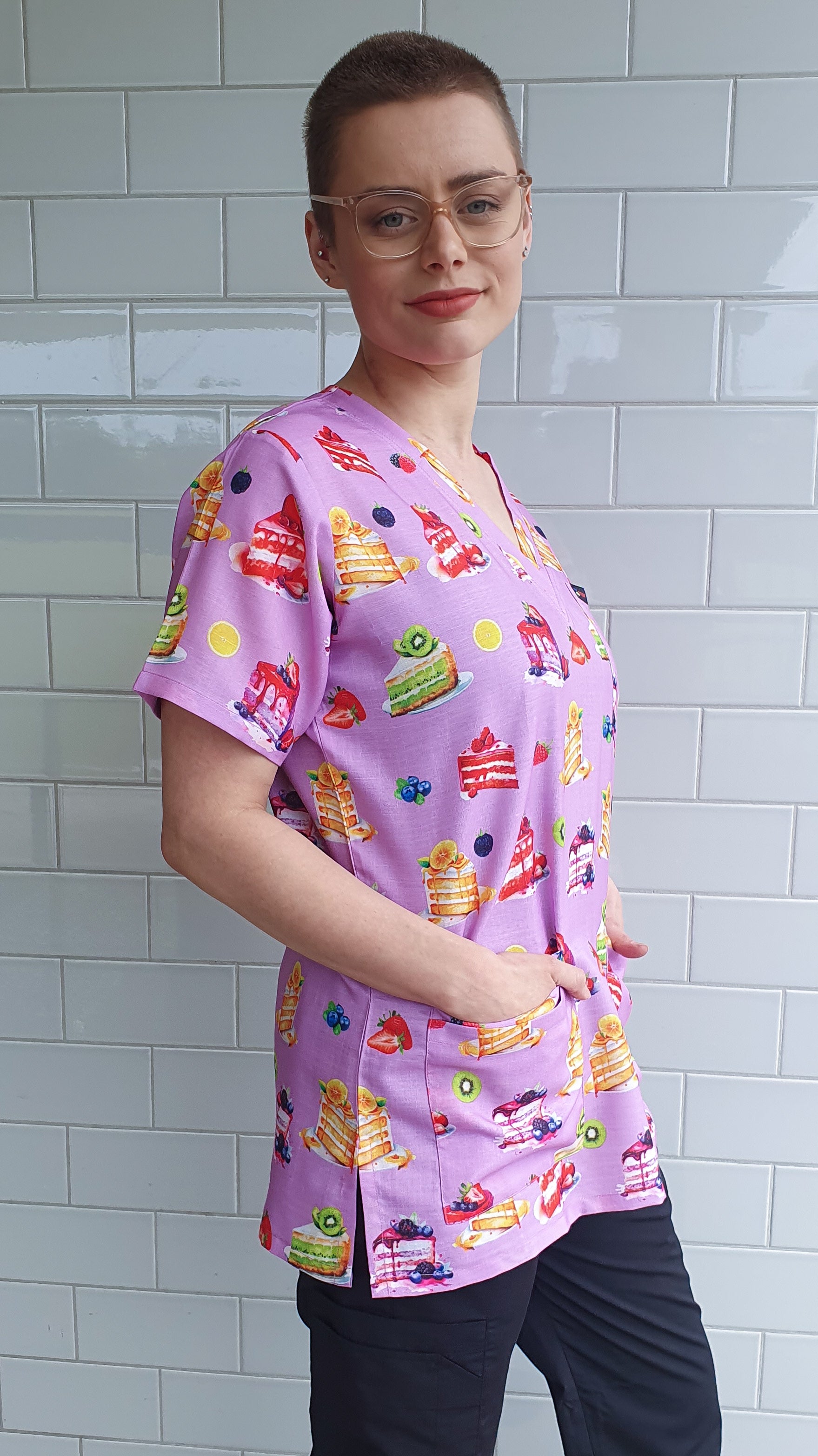 Sweet Cake Slice With Fruits Printed V-Neck Printed Scrub Top featuring a contemporary fit v neck with side slits. The scrub top features 1 chest pocket and 2 lower hip patch pocket with internal compartment pockets to store all of your essentials .The top also has 2 Pen Pockets on Left Sleeve. This scrub is made of High Quality ,Soft, light weight polyester cotton ,giving throughout the year comfort.