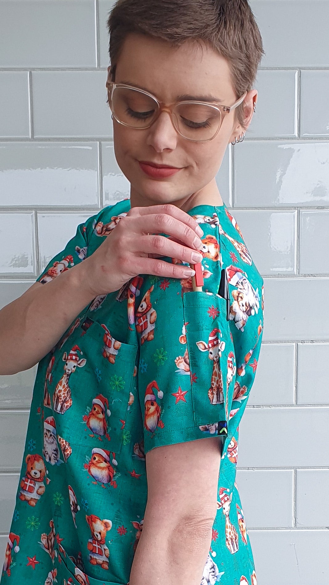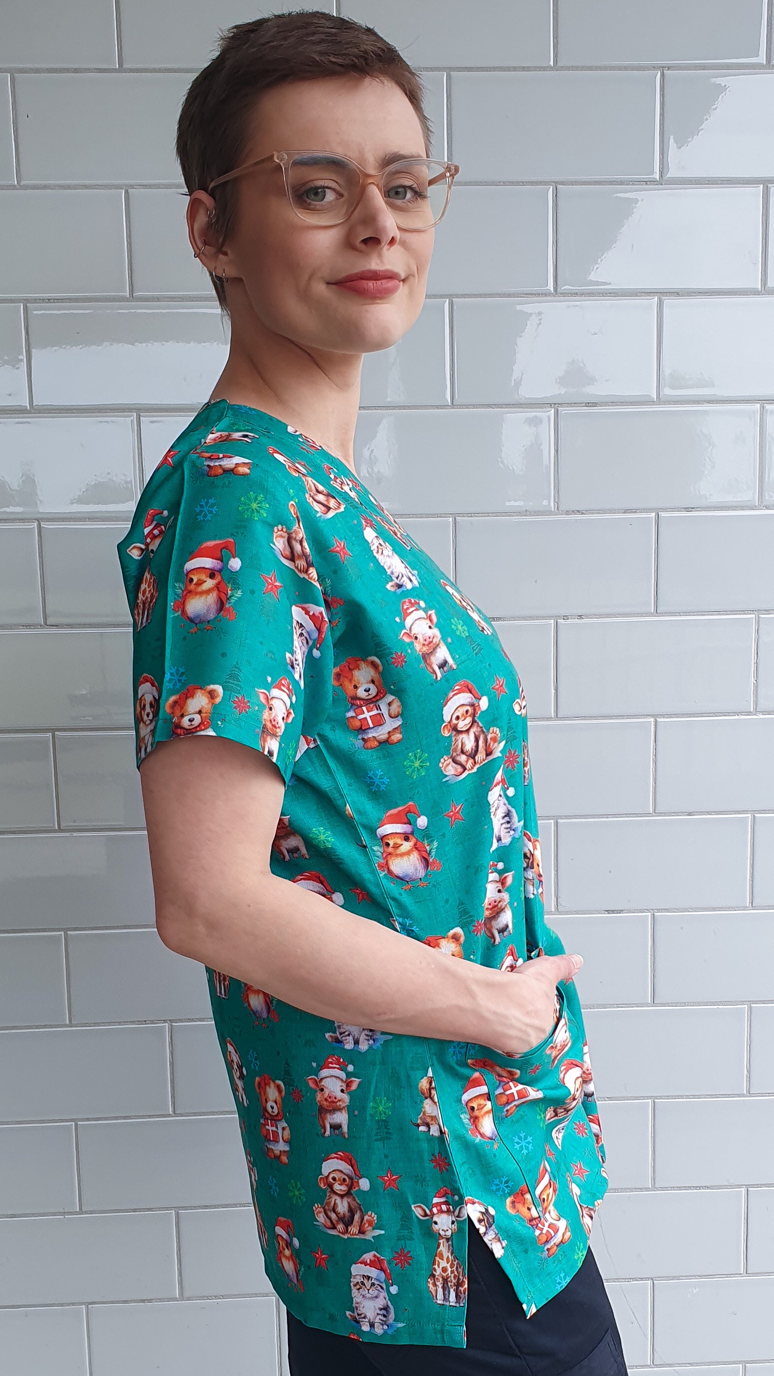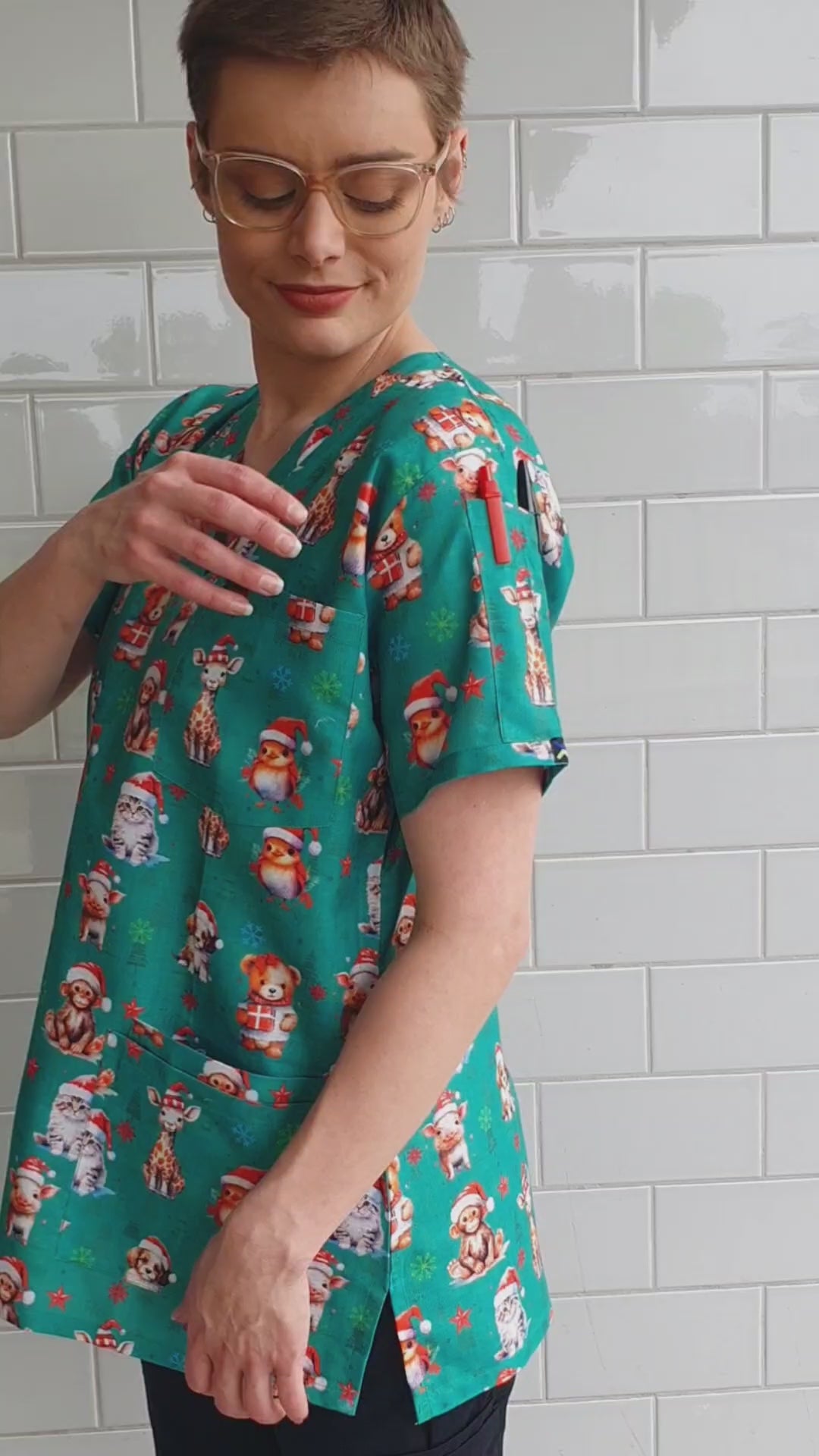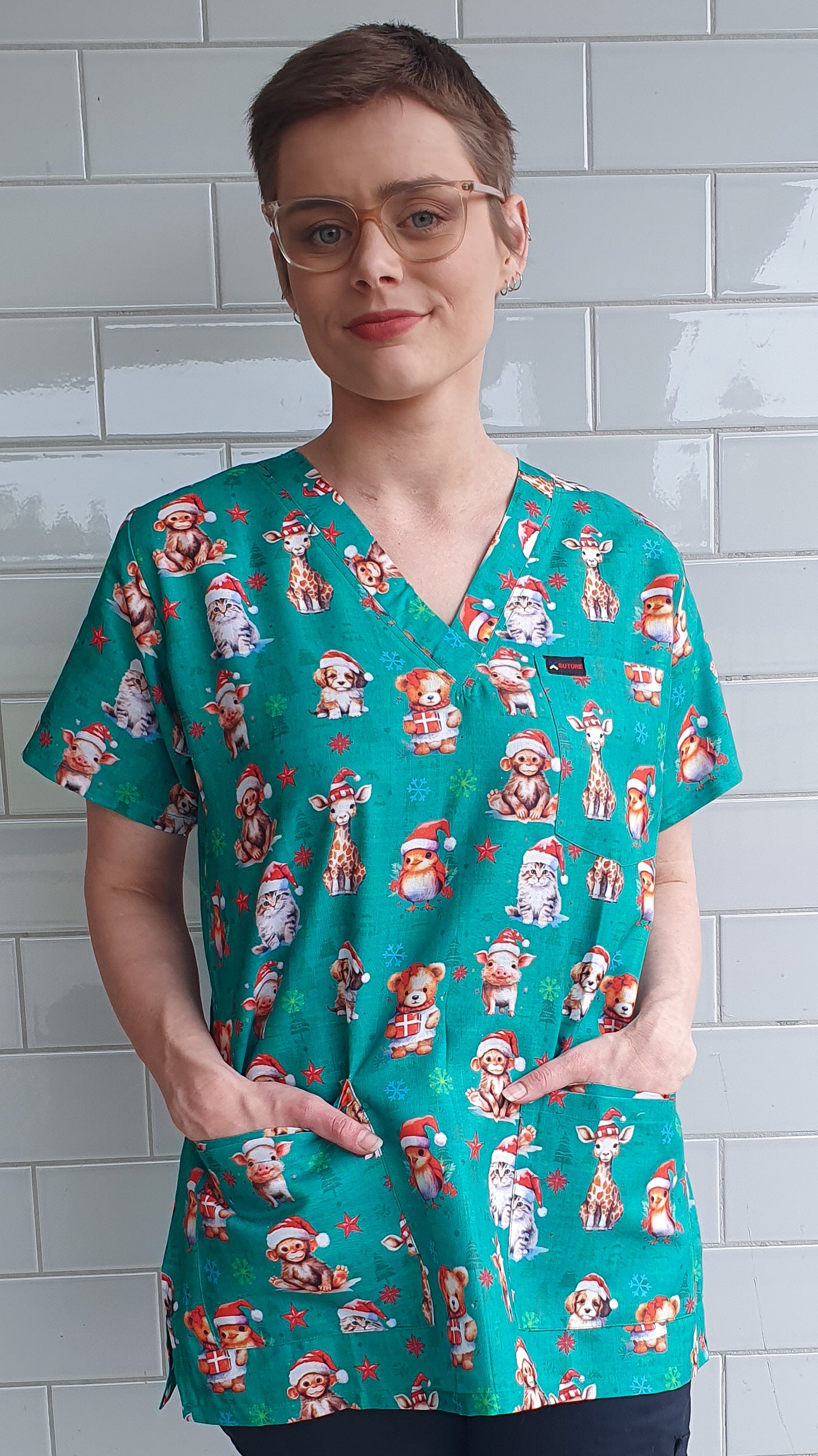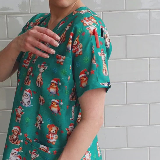 Christmas Animal print medical uniform fun Scrub Top featuring a contemporary fit v neck with side slits. This Christmas scrub top features 1 chest pocket and 2 lower hip patch pocket with internal compartment pockets to store all of your essentials .The top also has 2 Pen Pockets on Left Sleeve. This scrub top is made of Poly Cotton Fabric .