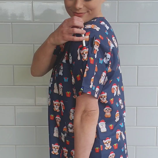 A perfect christmas scrub top to uplift the spirit , joy and fun of christmas featuring Puppies with christmas hat and gift