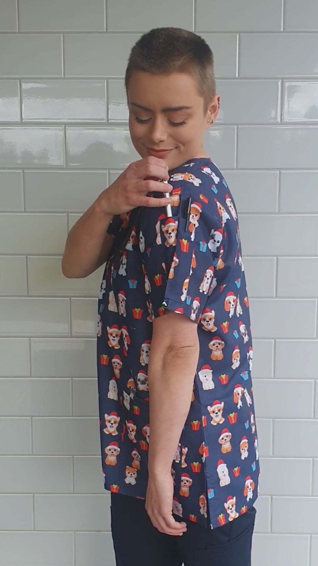 Cute puppies printed Christmas medical uniform fun Scrub Top featuring a contemporary fit v neck with side slits. This Christmas scrub top features a simple design with 2 lower hip patch pocket .This scrub is made of High Quality ,Soft, light weight Polyester Cotton ,giving throughout the year comfort.