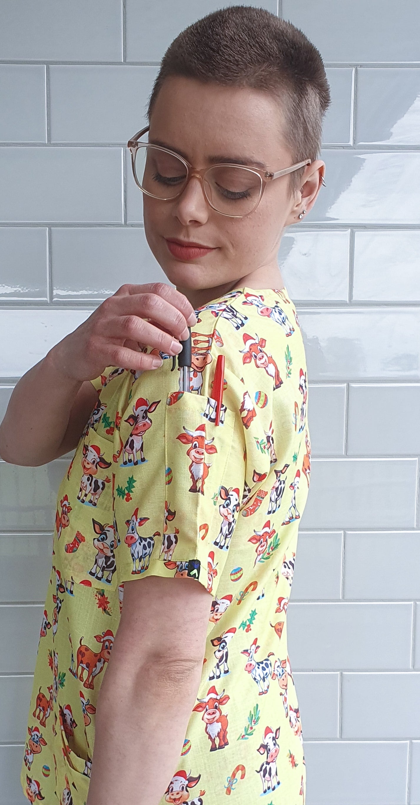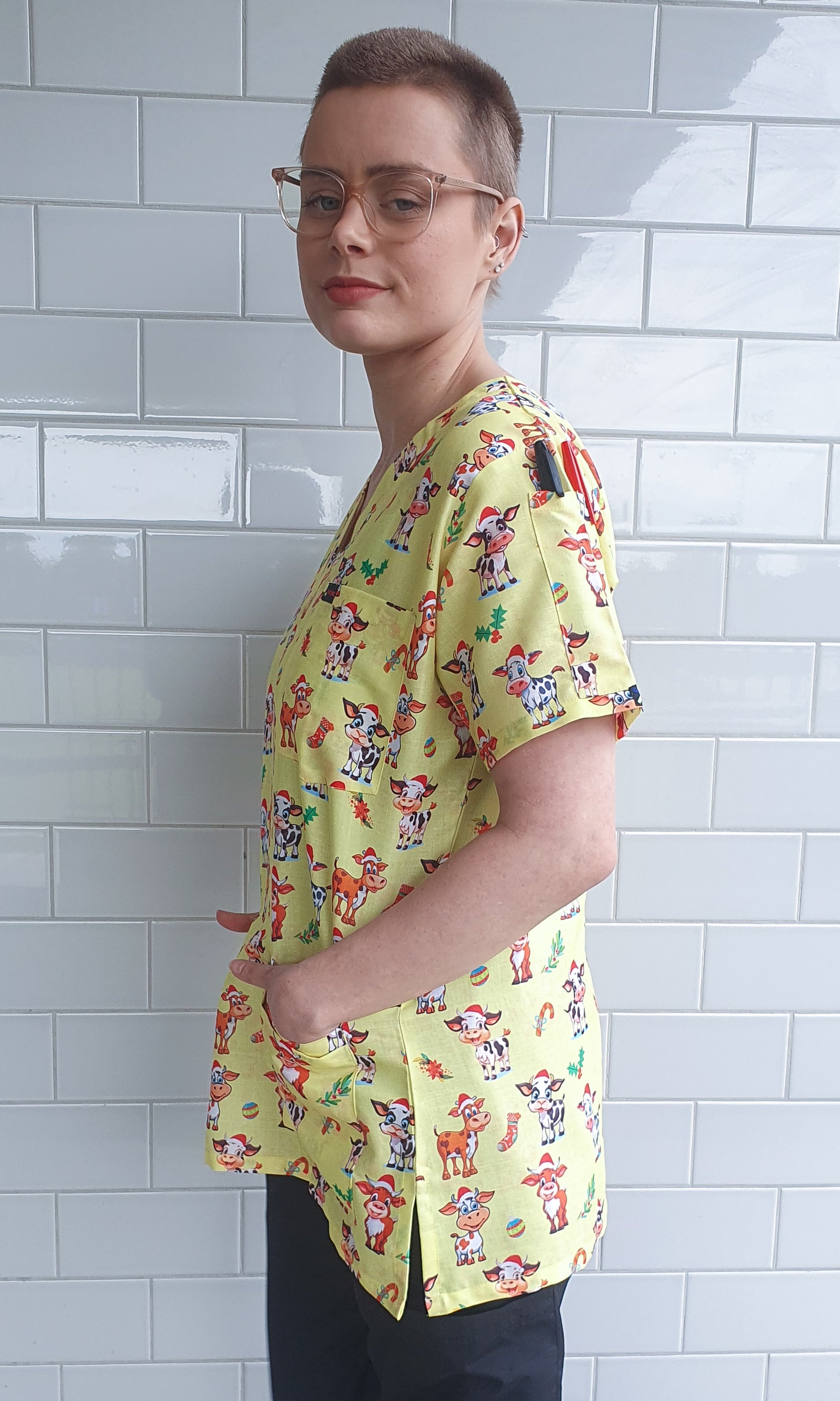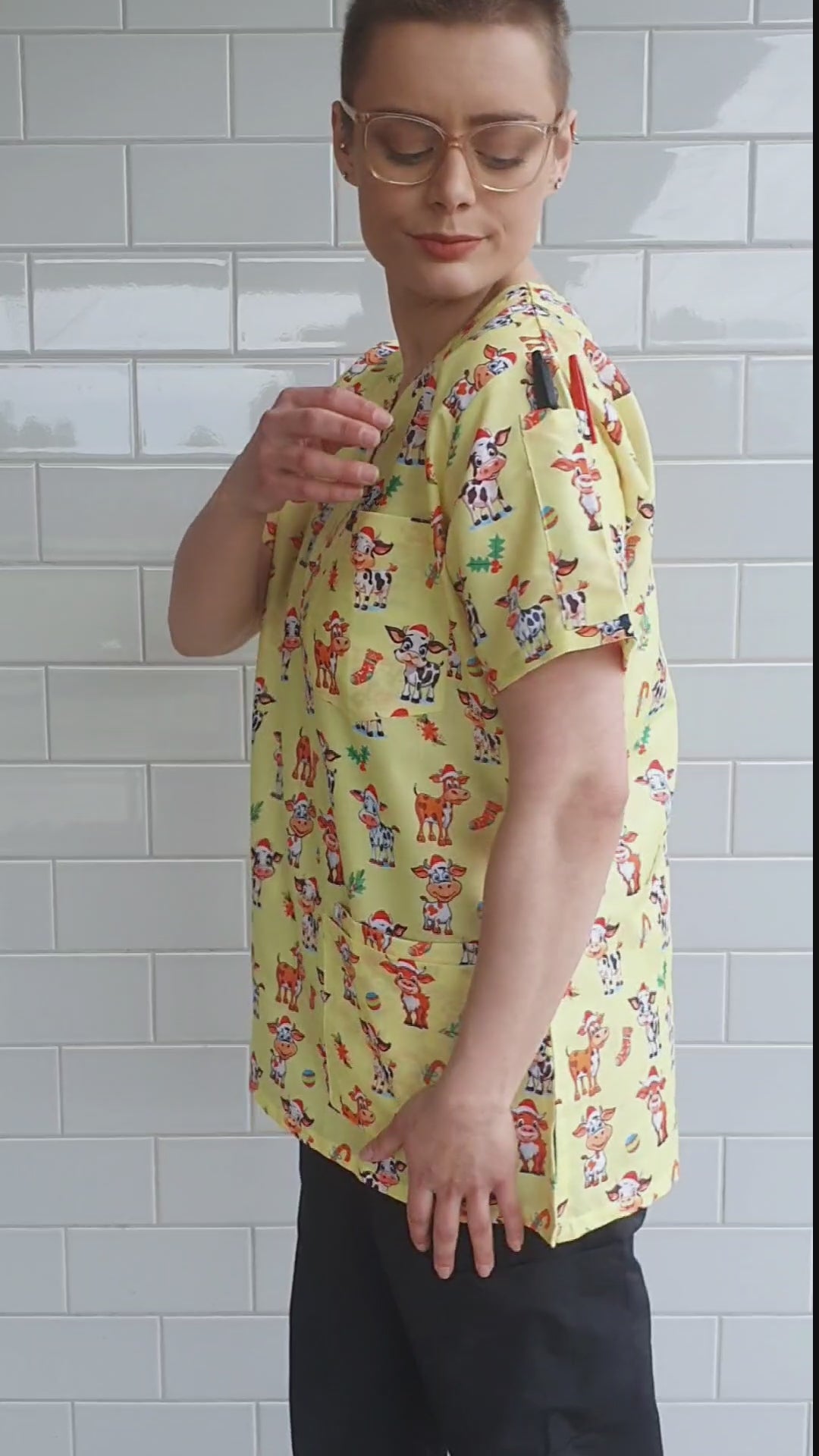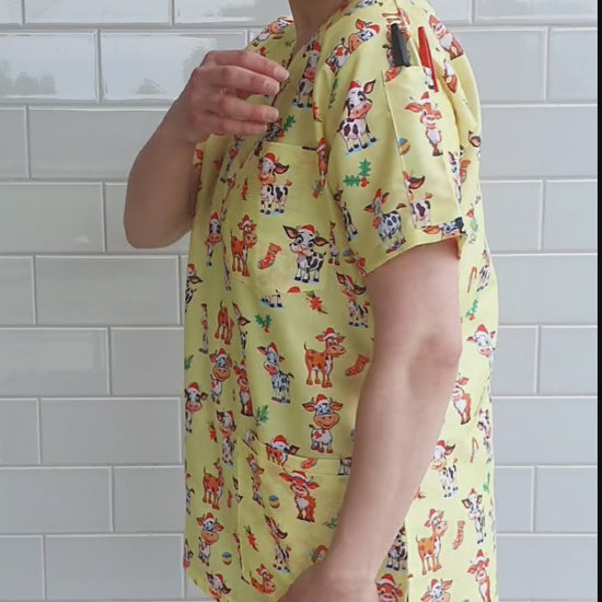 Cute Cow With Christmas Hat print medical uniform fun Scrub Top featuring a contemporary fit v neck with side slits. This Christmas scrub top features 1 chest pocket and 2 lower hip patch pocket with internal compartment pockets to store all of your essentials .The top also has 2 Pen Pockets on Left Sleeve. This scrub is made of Poly Cotton Fabric .