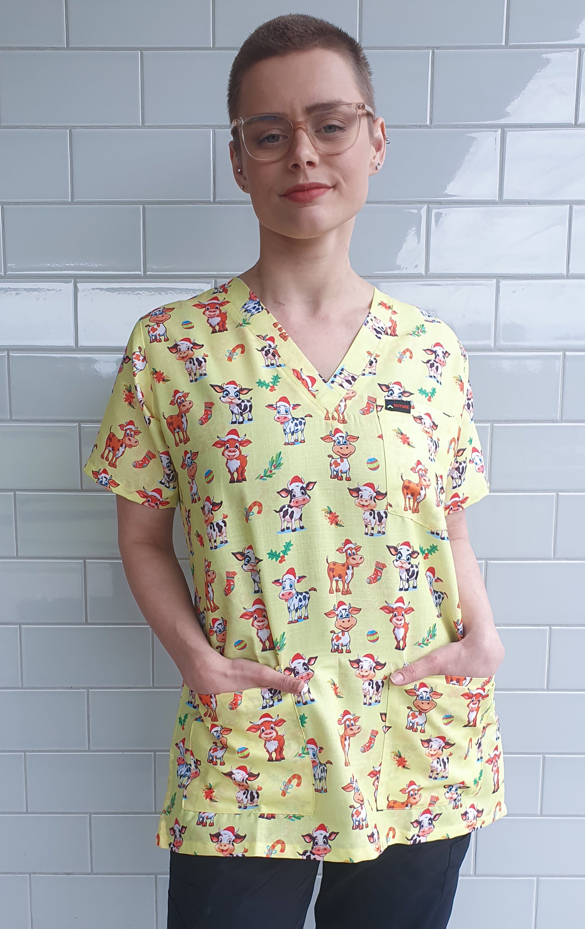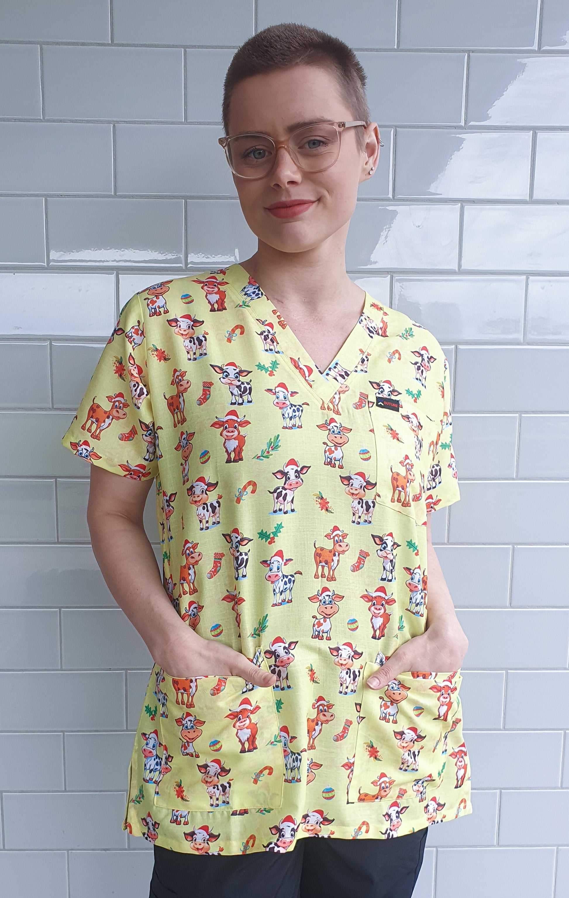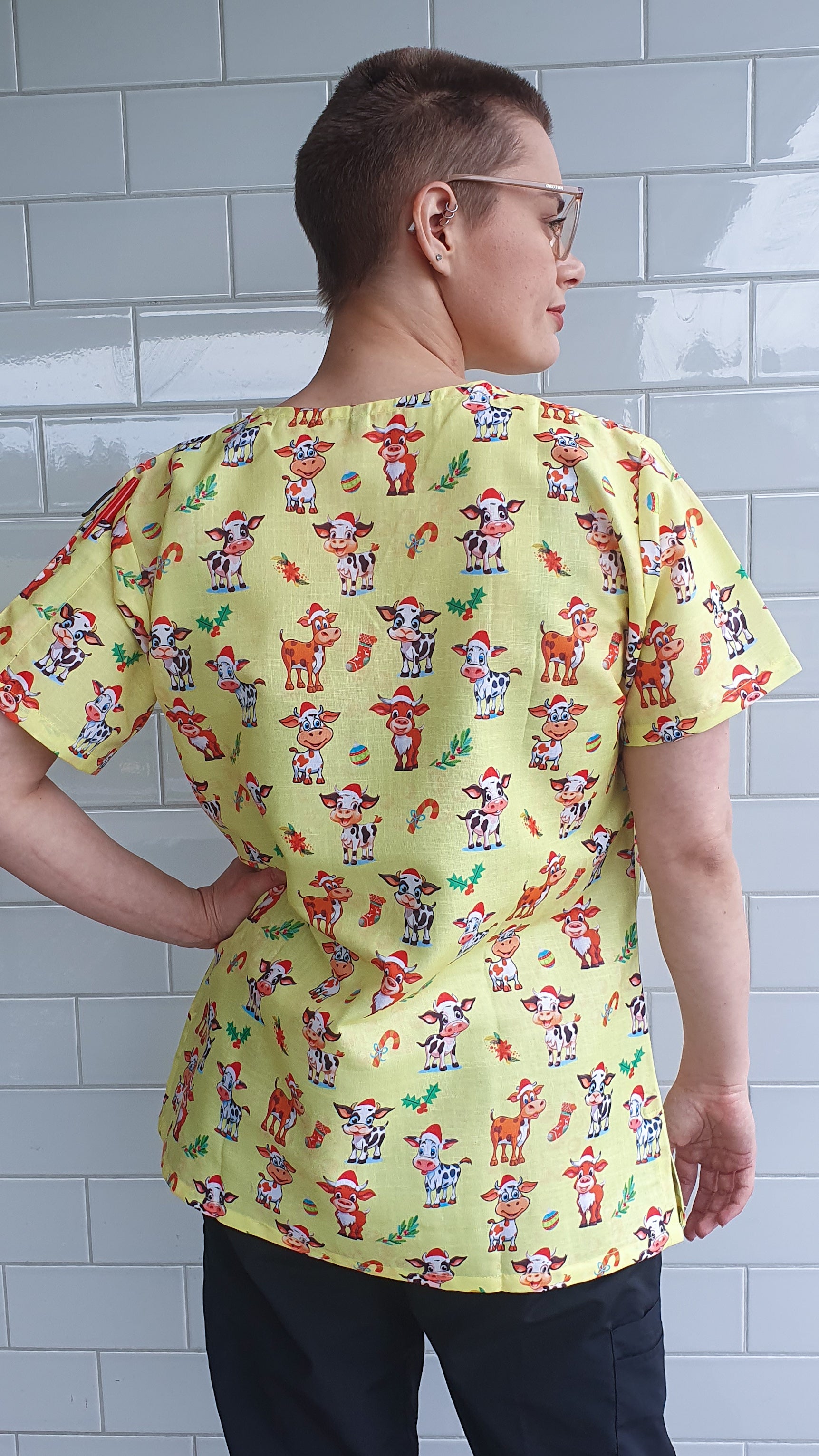 Cute Cow With Christmas Hat Printed Scrub Top Australia