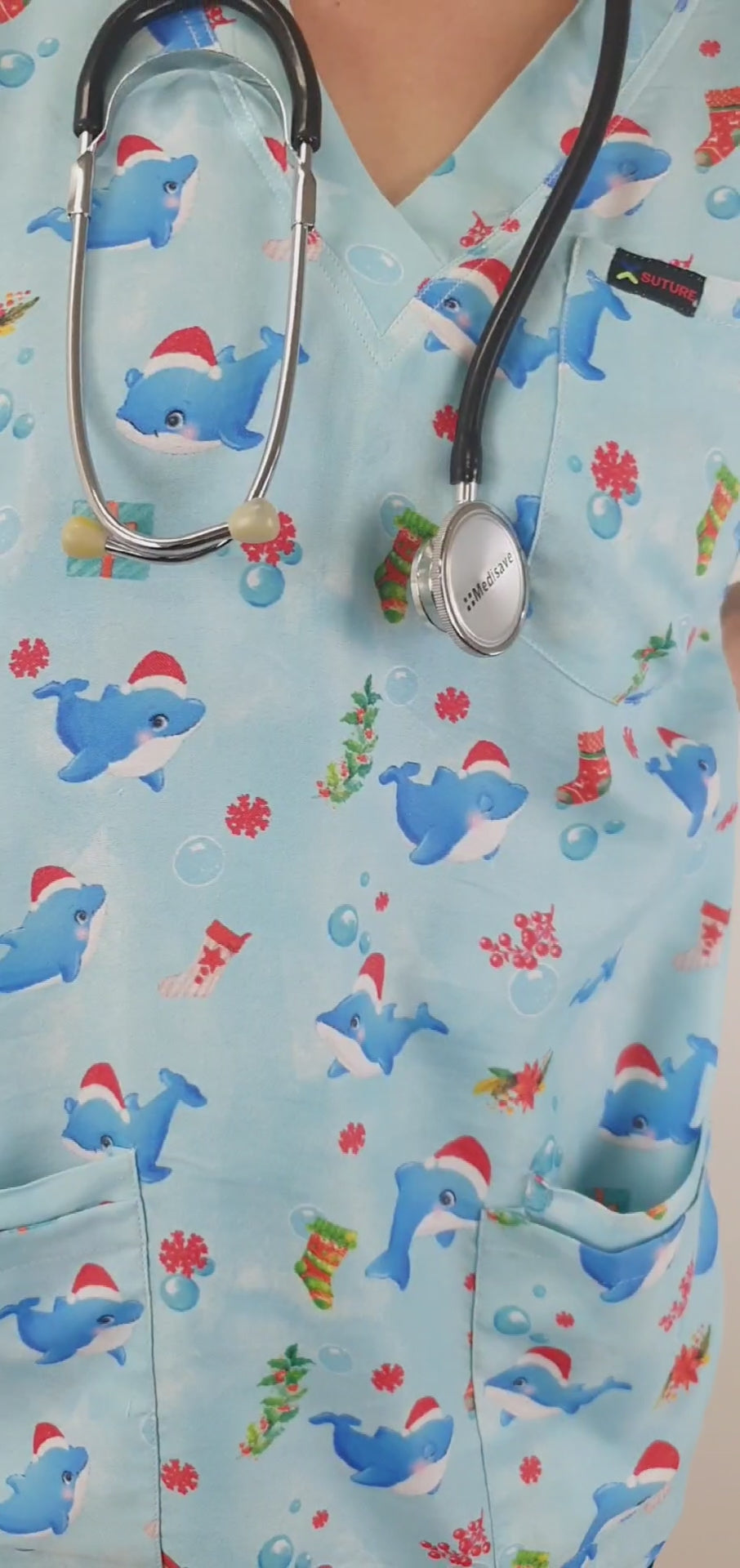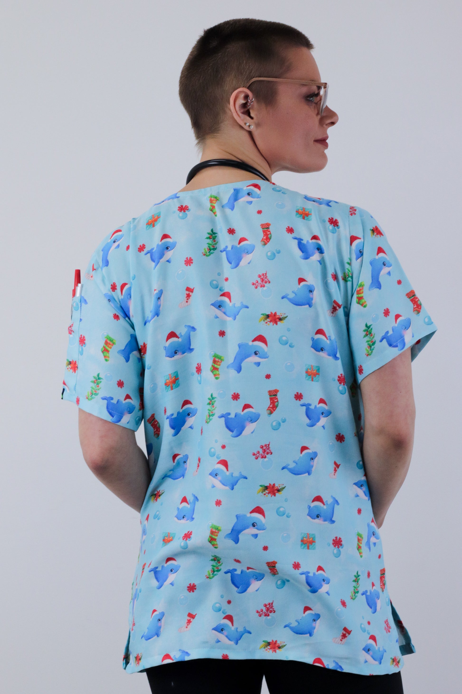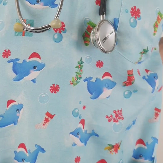 Cute Dolphin Large printed Christmas medical uniform fun Scrub Top featuring a contemporary fit v neck with side slits. The scrub top features 1 chest pocket and 2 lower hip patch pocket with internal compartment pockets to store all of your essentials .The top also has 2 Pen Pockets on Left Sleeve. This scrub is made of High Quality ,Soft, light weight polyester cotton ,giving throughout the year comfort.