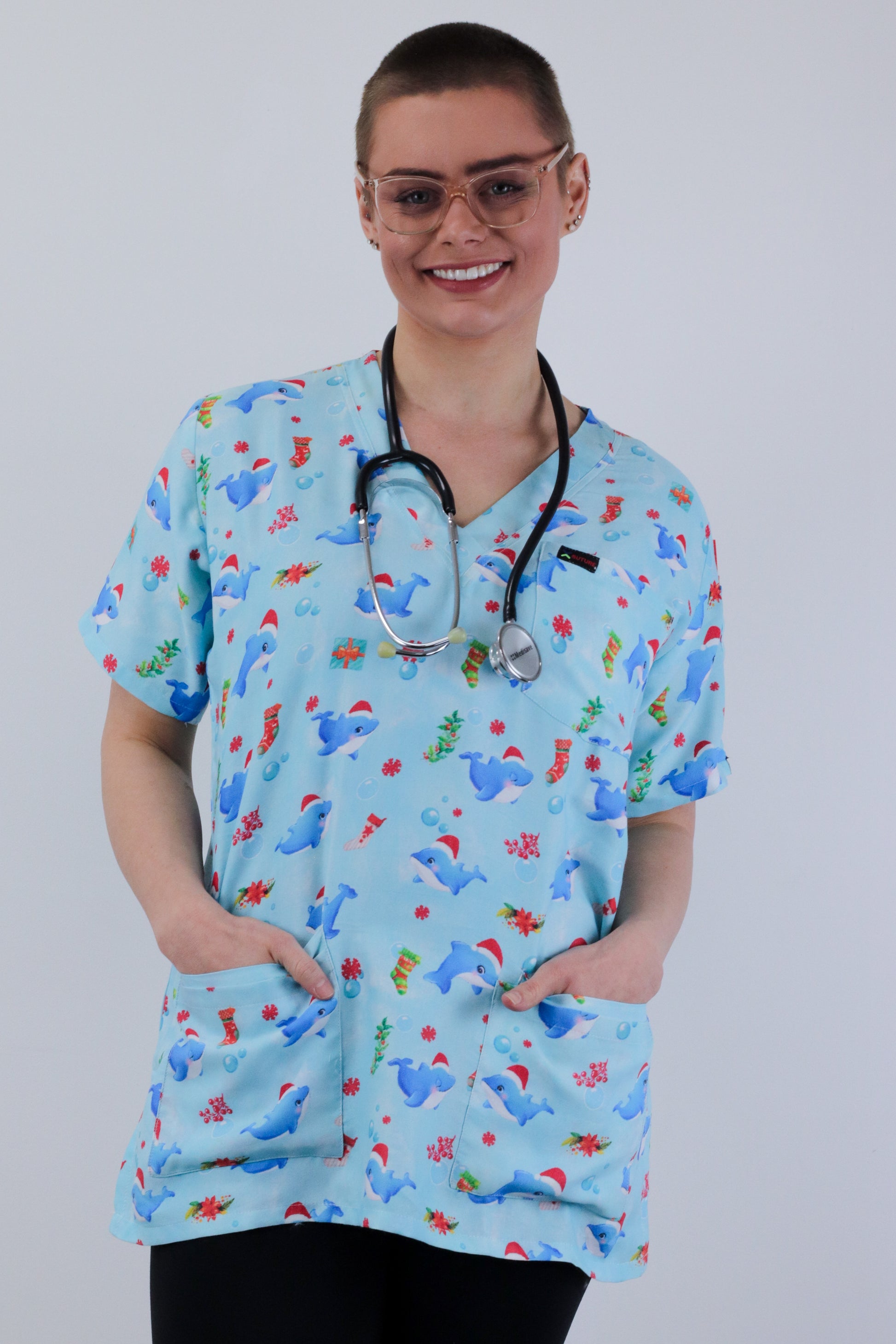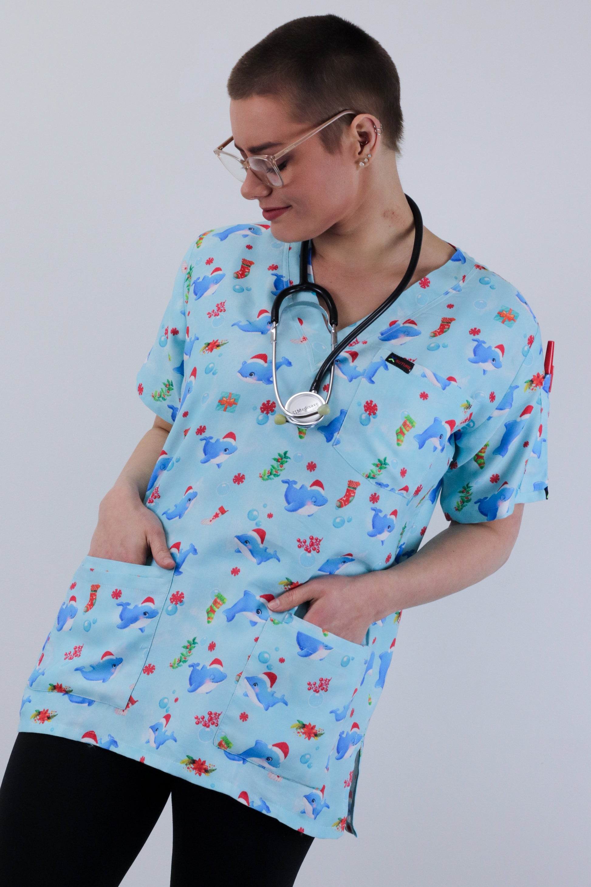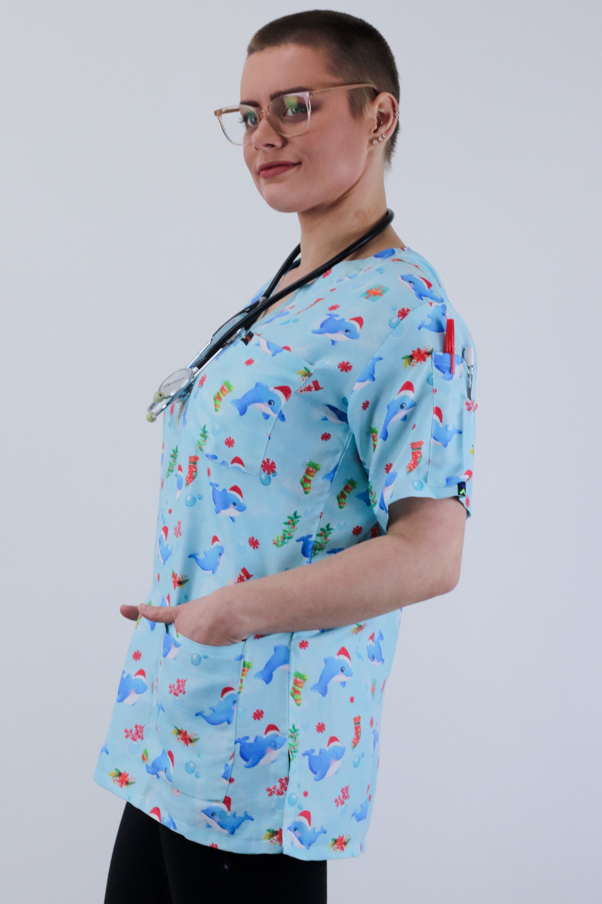 Cute Dolphin Large printed Christmas medical uniform fun Scrub Top featuring a contemporary fit v neck with side slits. The scrub top features 1 chest pocket and 2 lower hip patch pocket with internal compartment pockets to store all of your essentials .The top also has 2 Pen Pockets on Left Sleeve. This scrub is made of High Quality ,Soft, light weight polyester cotton ,giving throughout the year comfort.