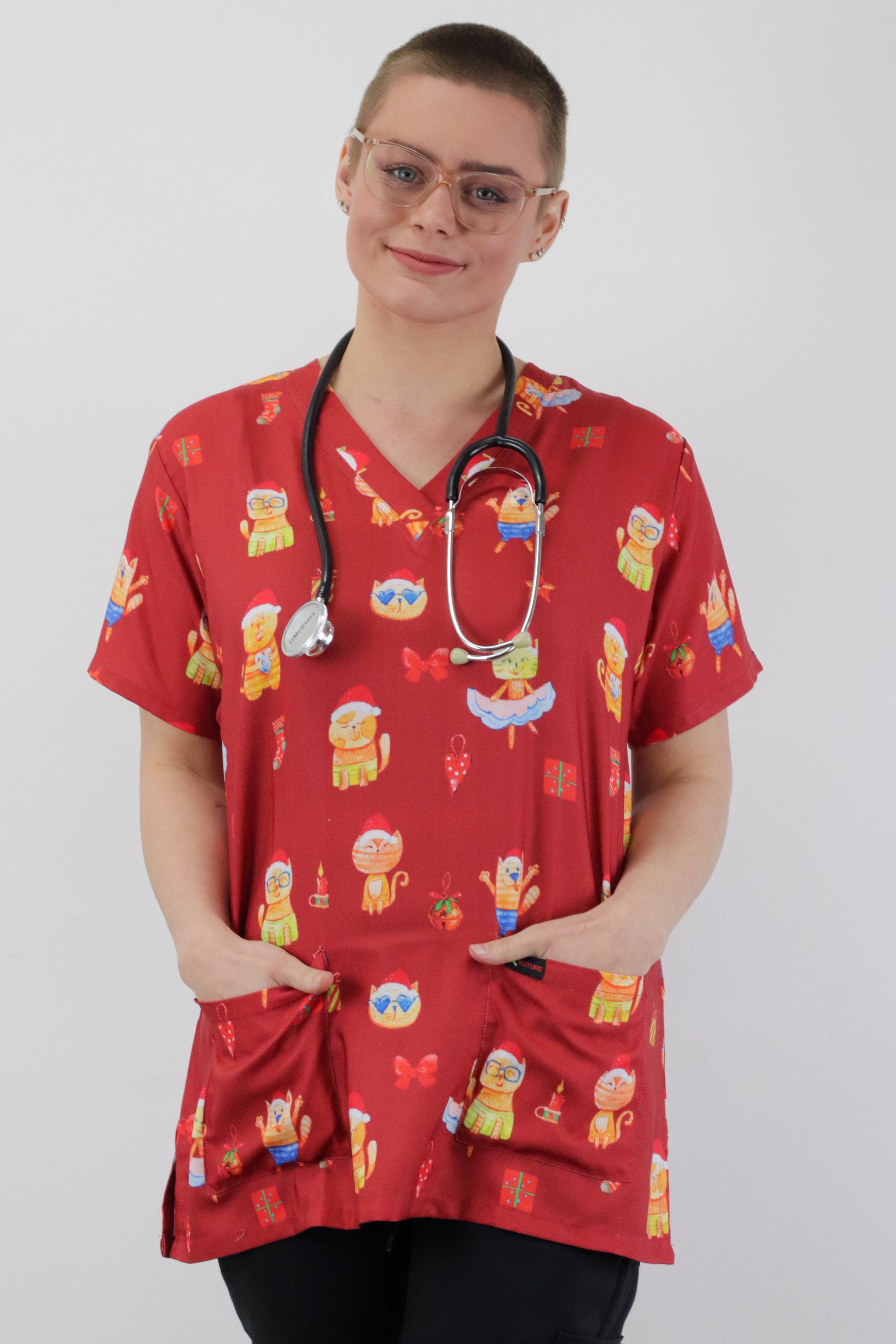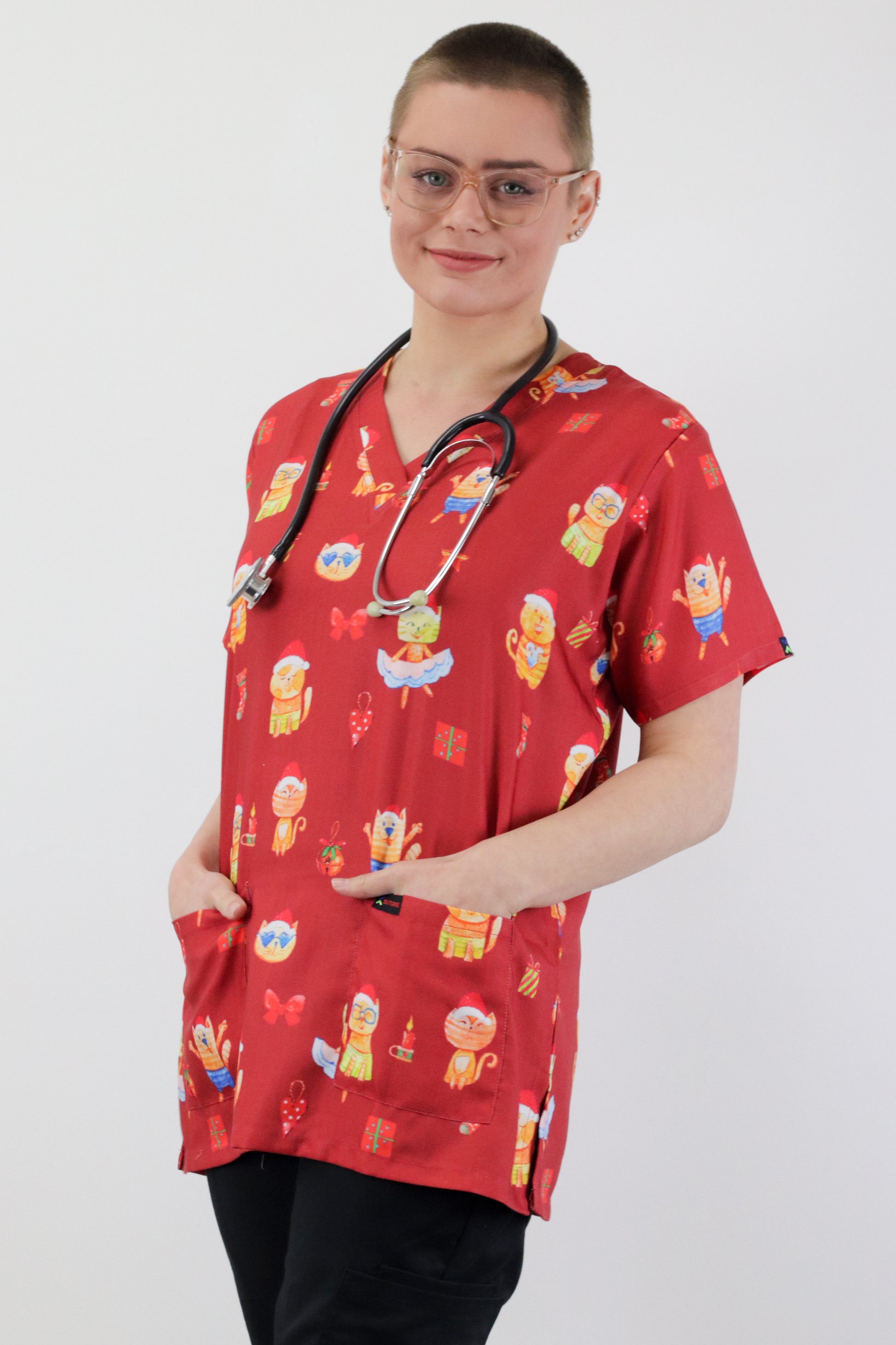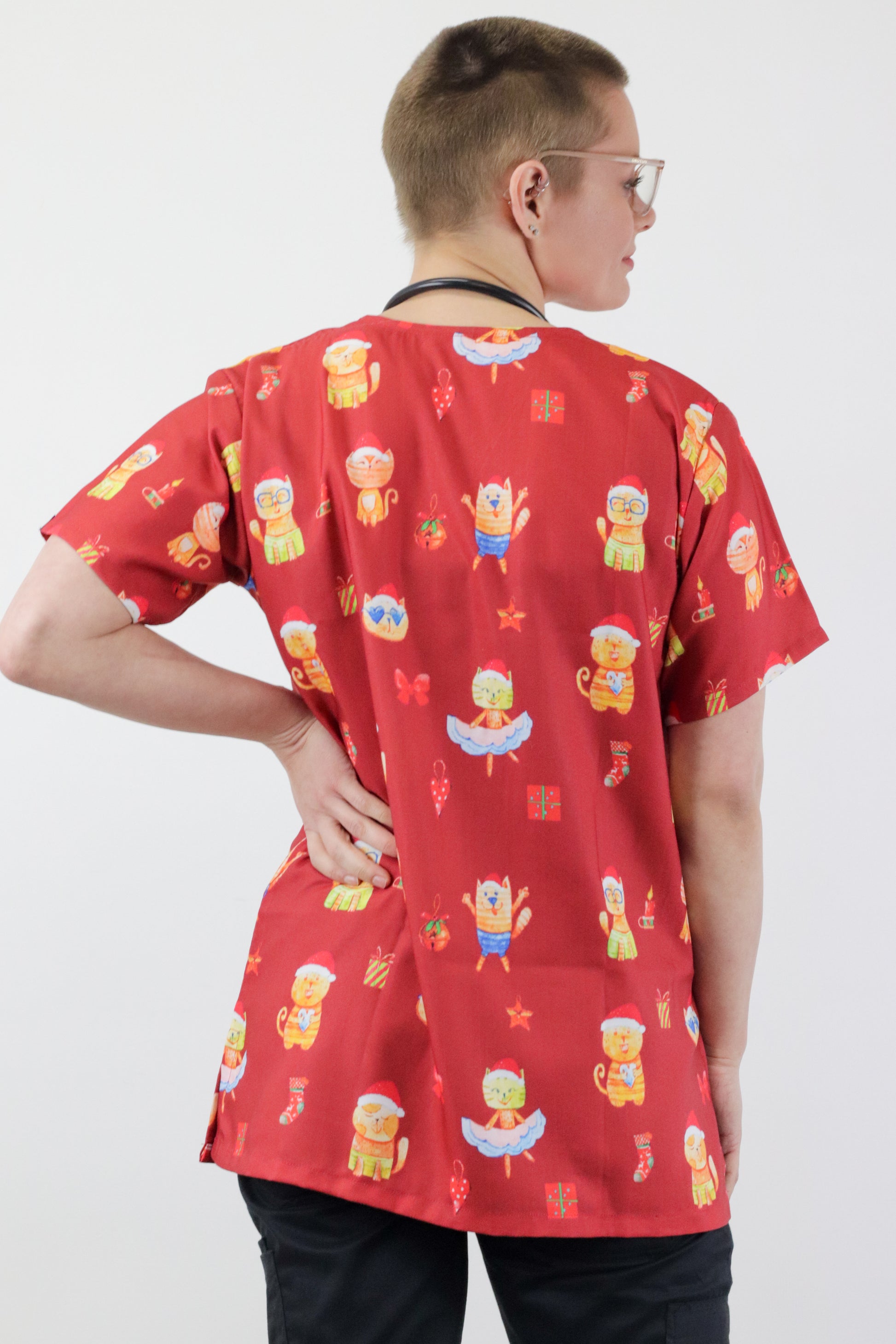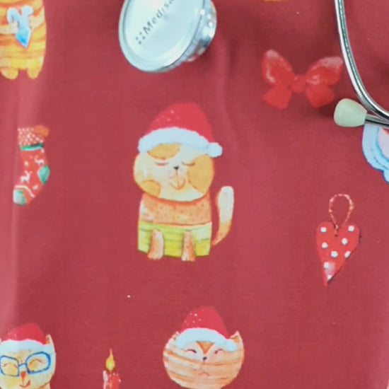 Ginger Cat with Christmas hat and gifts printed Christmas medical uniform fun Scrub Top featuring a contemporary fit v neck with side slits. This Christmas scrub top features a simple design with 2 lower hip patch pocket .This scrub is made of High Quality ,Soft, light weight Polyester Cotton ,giving throughout the year comfort.