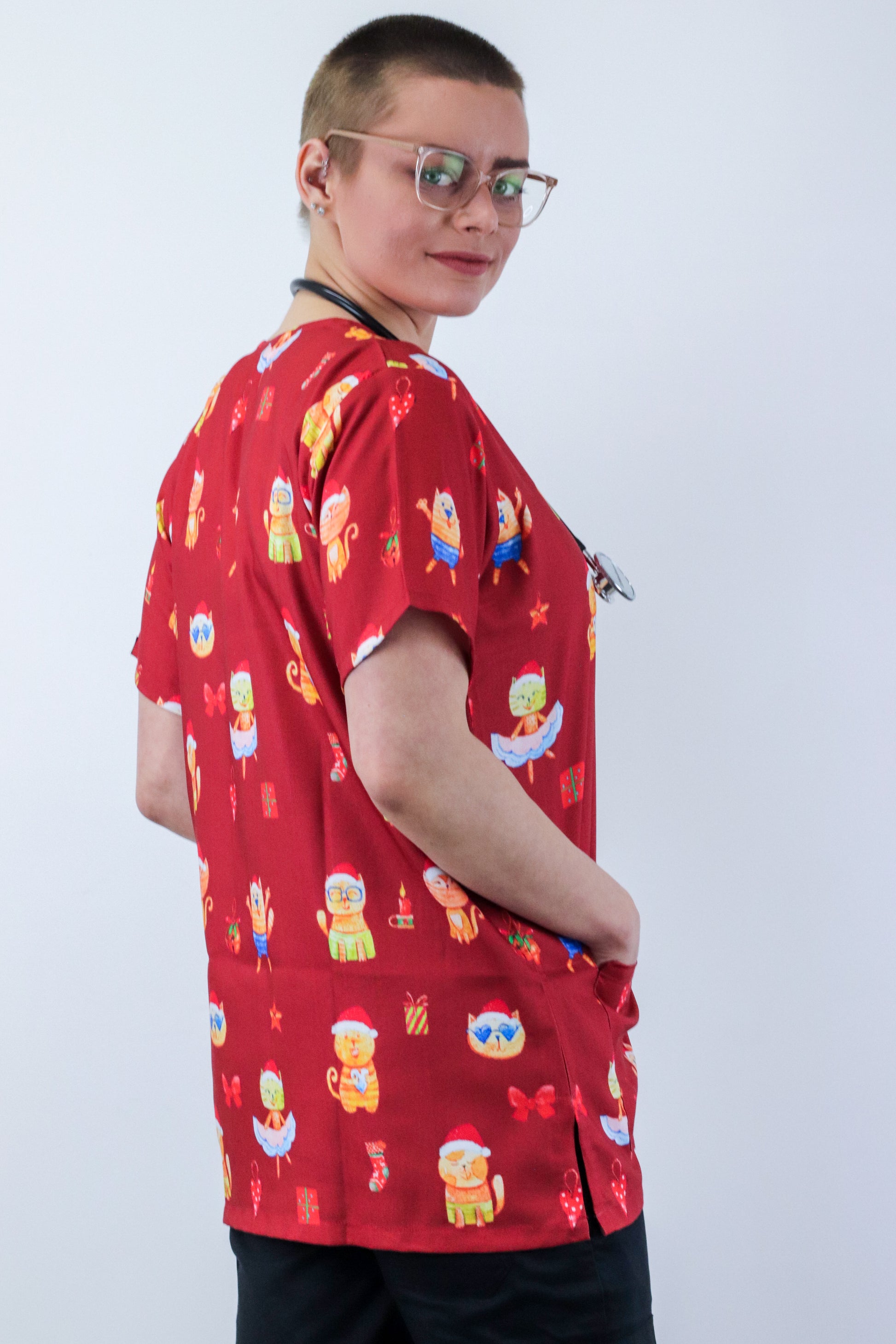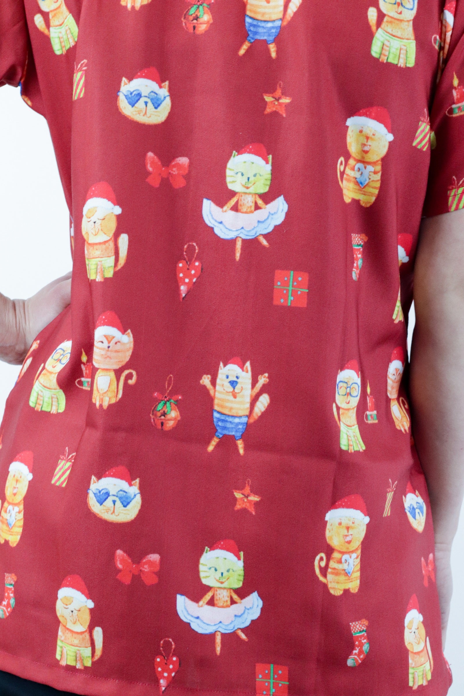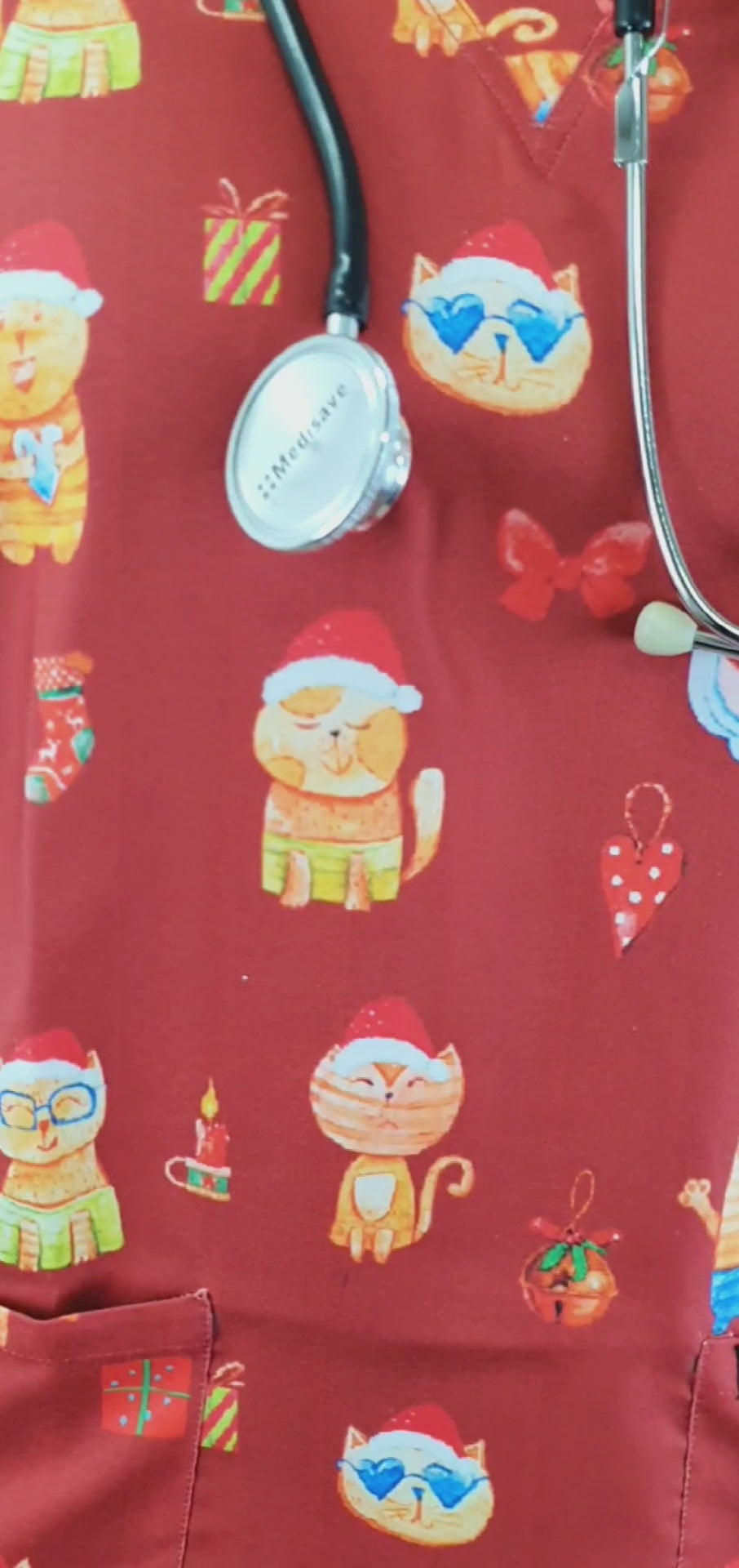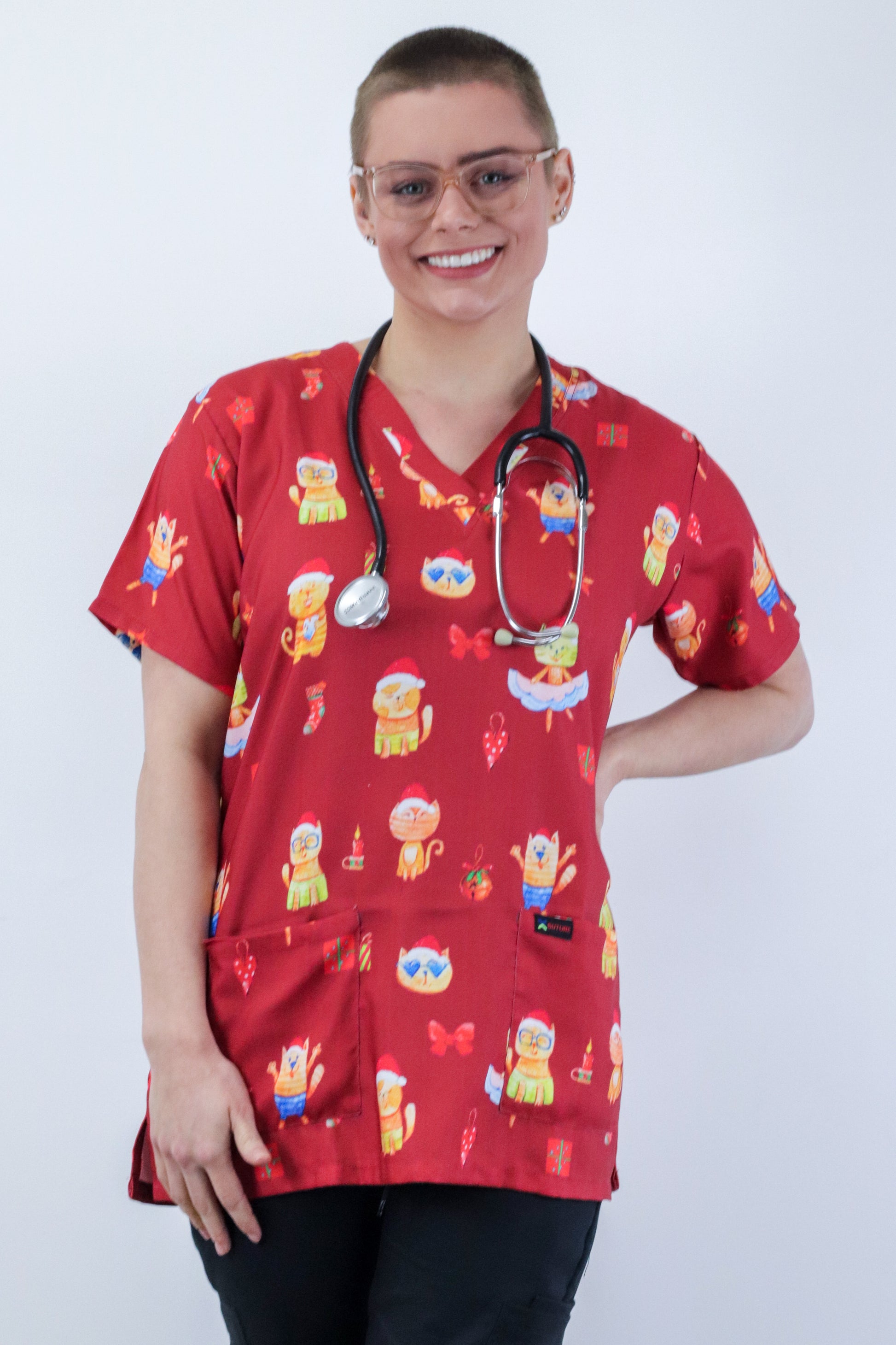 Ginger Cat with Christmas hat and gifts printed Christmas medical uniform fun Scrub Top featuring a contemporary fit v neck with side slits. This Christmas scrub top features a simple design with 2 lower hip patch pocket .This scrub is made of High Quality ,Soft, light weight Polyester Cotton ,giving throughout the year comfort.