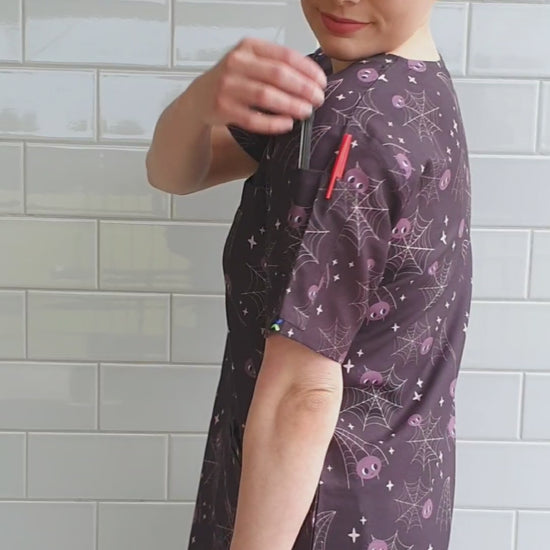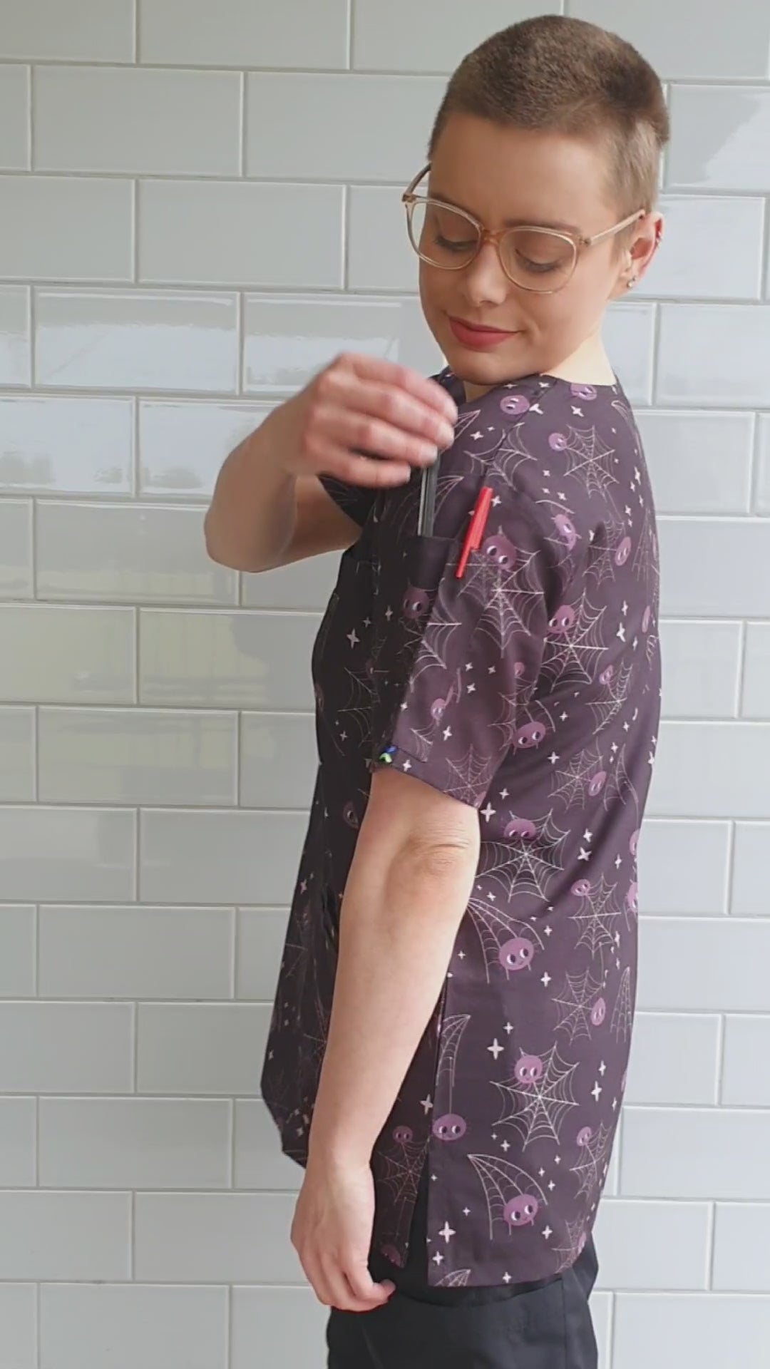 Cute Halloween Spider Web print medical uniform fun Scrub Top featuring a contemporary fit v neck with side slits. This Christmas scrub top features 1 chest pocket and 2 lower hip patch pocket with internal compartment pockets to store all of your essentials .The top also has 2 Pen Pockets on Left Sleeve. This scrub is made of High Quality ,Soft, light weight polyester cotton ,giving throughout the year comfort.