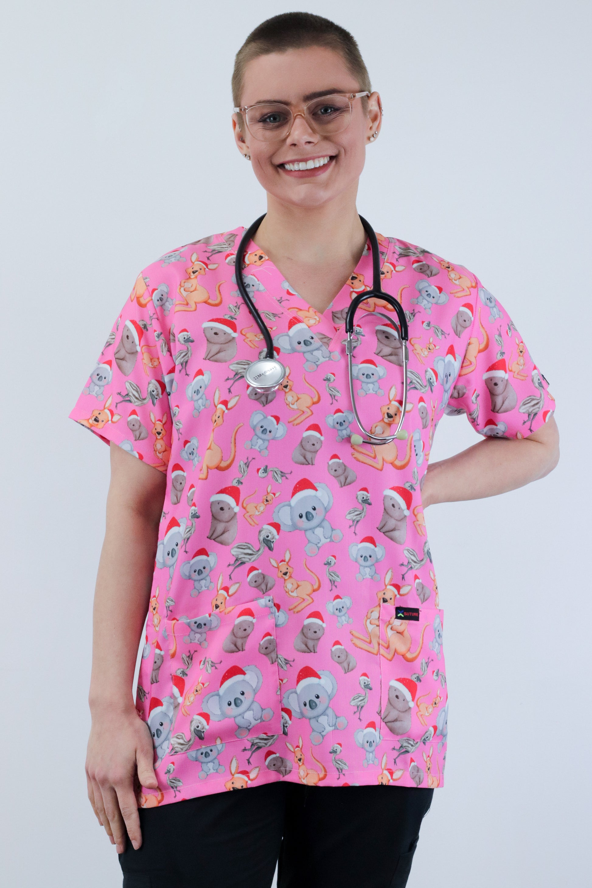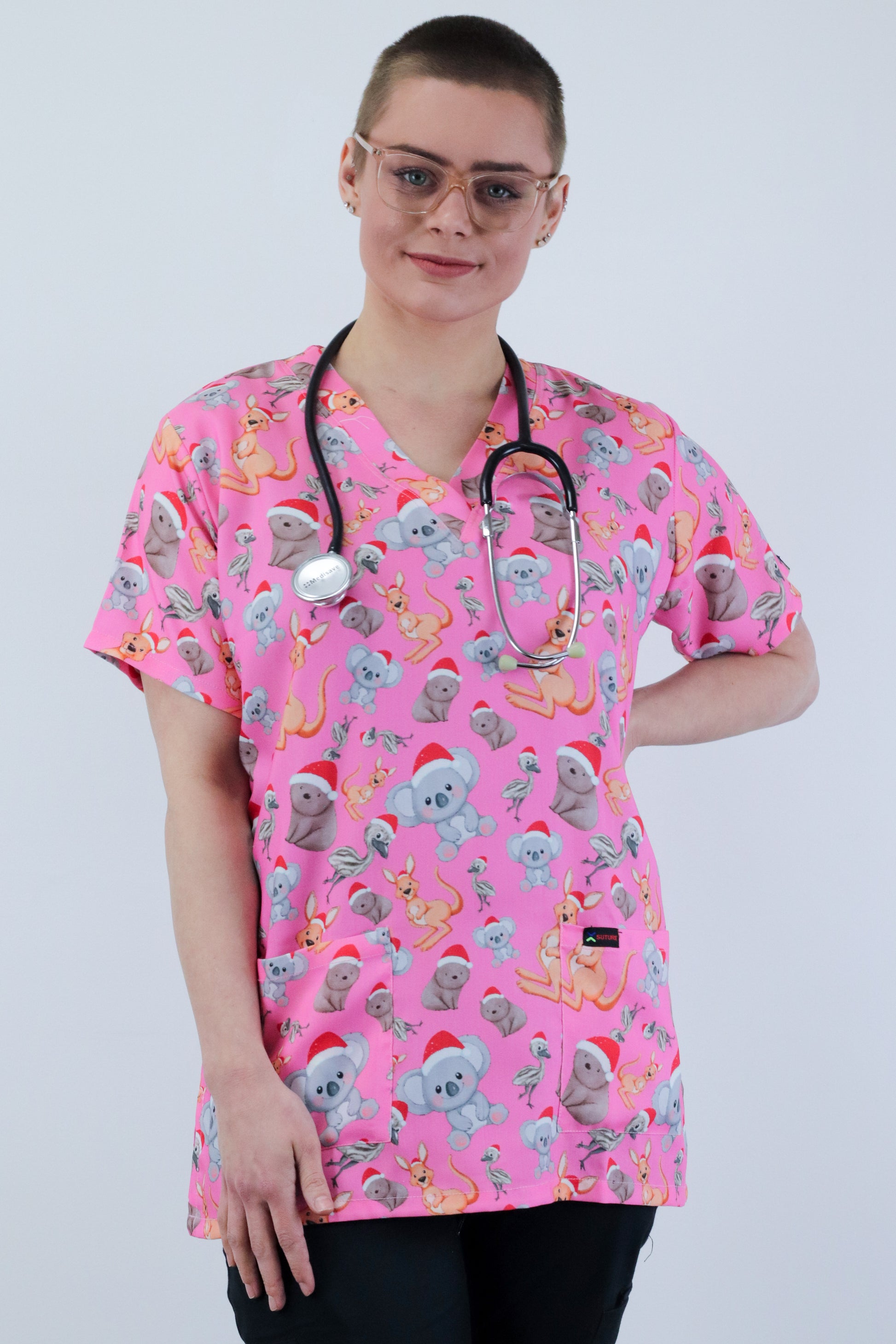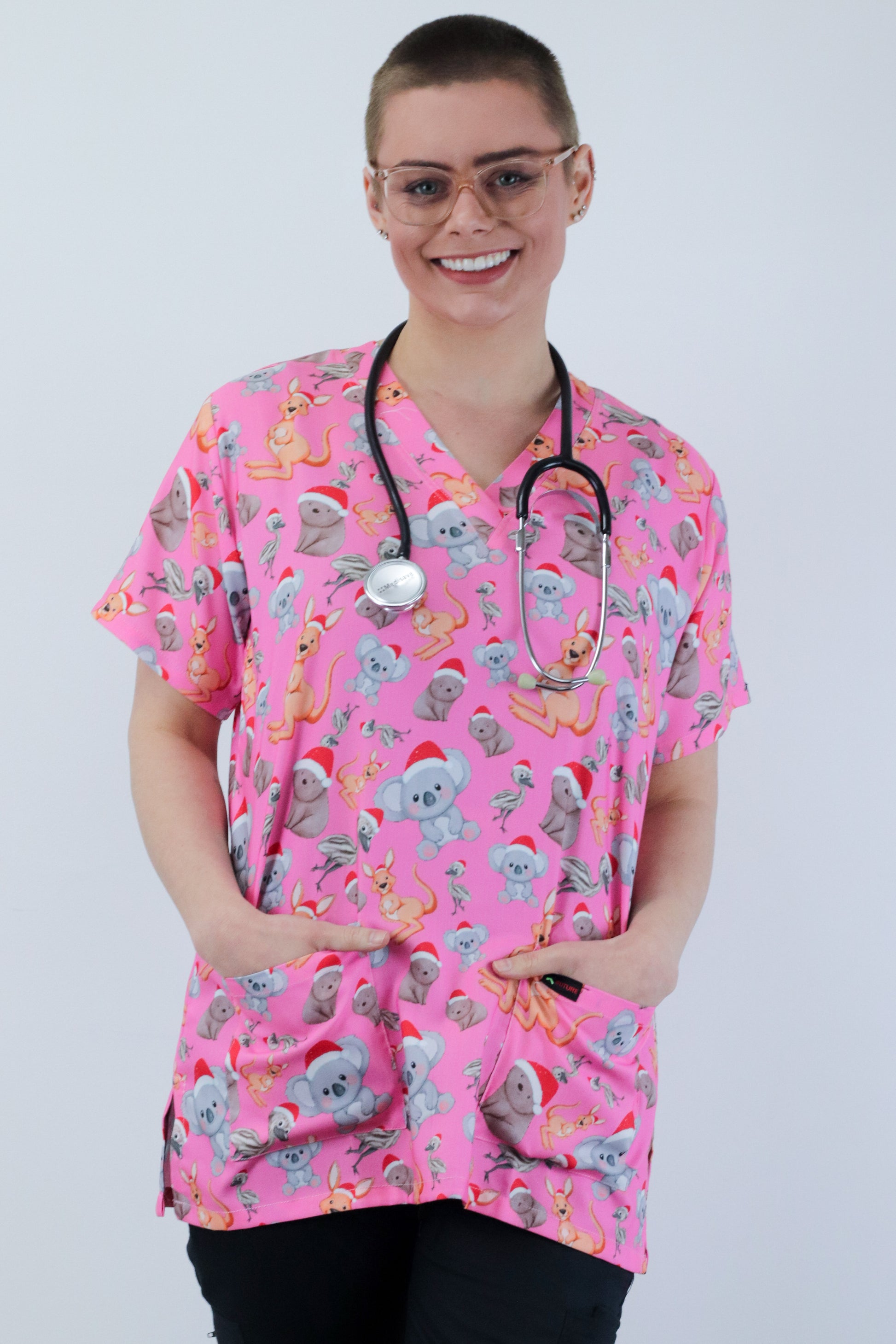 kangaroo,koala, emu and wombat Printed Pink Christmas Scrub Top Australia
