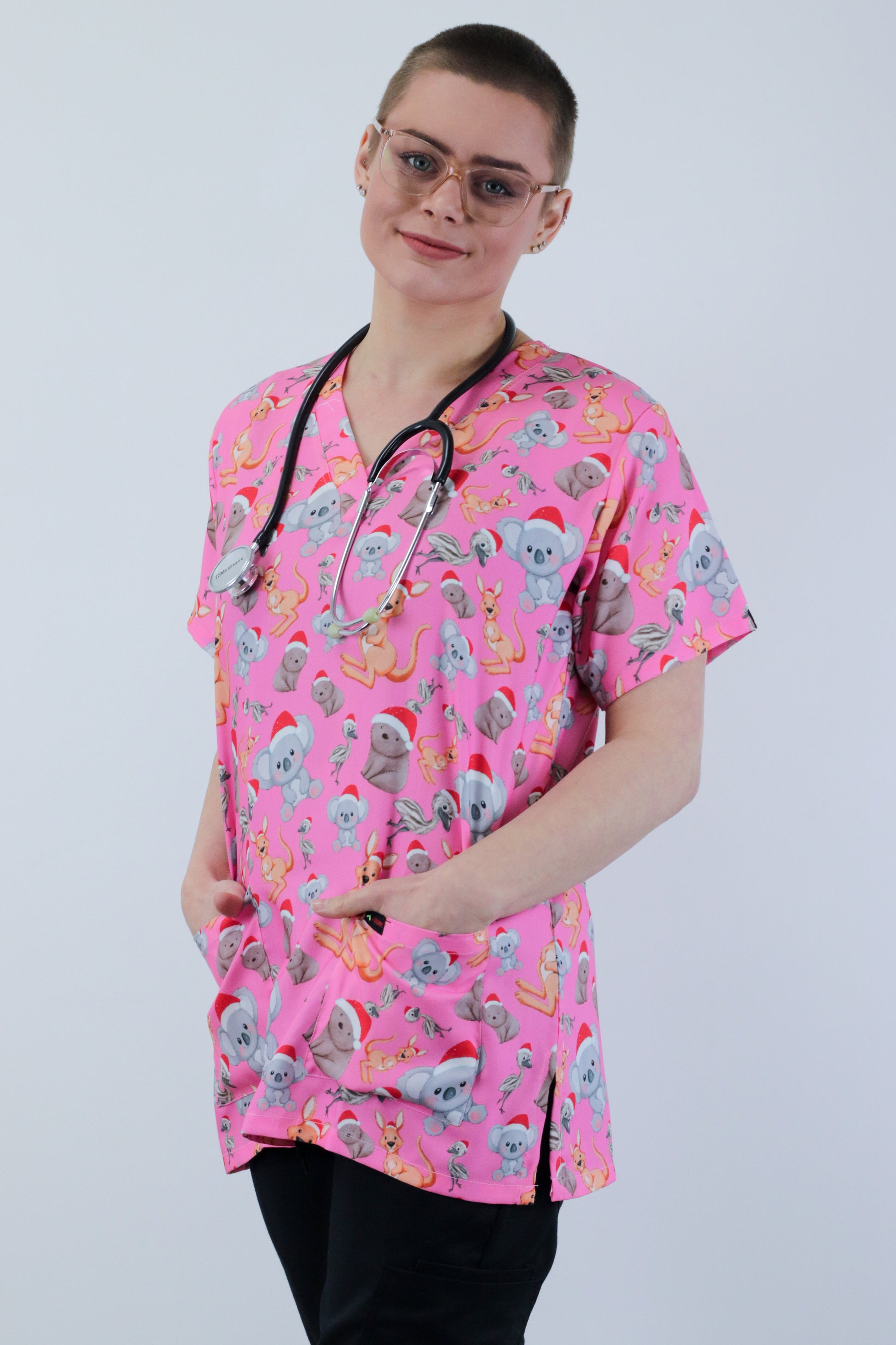 Australian native animals like kangaroo,koala, emu and wombat in christmas hat are Printed in this fun Scrub Top featuring a contemporary fit v neck with side slits. The scrub top features a simple deisng of 2 lower hip patch pocket .This scrub is made of High Quality ,Soft, light weight polyester Cotton ,giving throughout the year comfort.