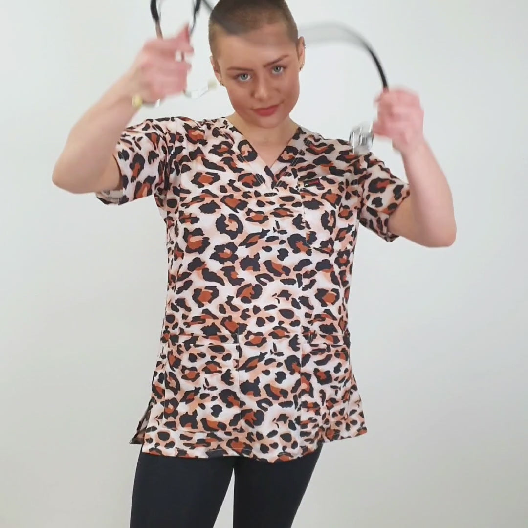 Colourful Leopard Printed medical uniform fun Scrub Top featuring a contemporary fit v neck with side slits. This scrub top features 1 chest pocket and 2 lower hip patch pocket with internal compartment pockets to store all of your essentials .The top also has 2 Pen Pockets on Left Sleeve. This scrub is made of High Quality ,Soft, light weight polyester cotton ,giving throughout the year comfort.