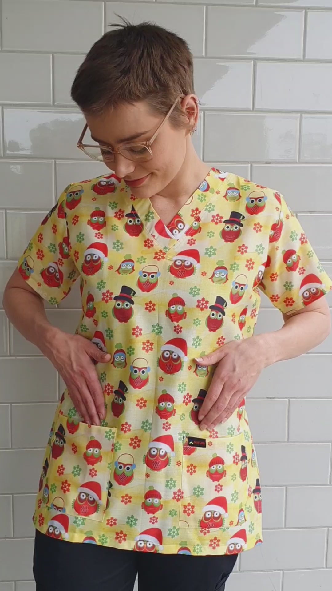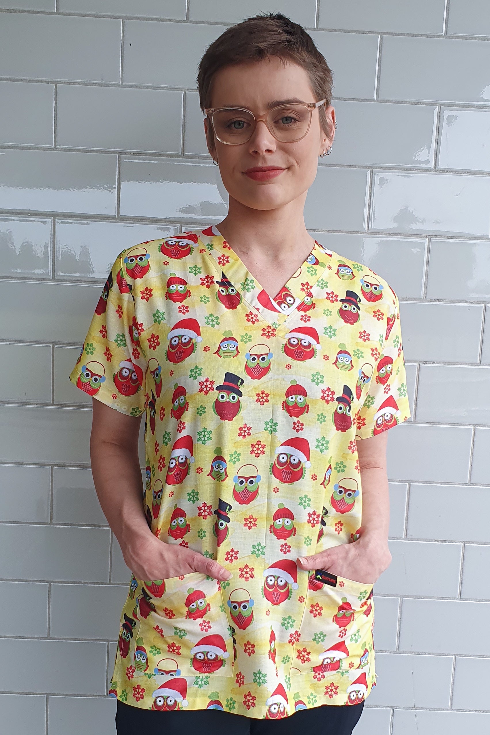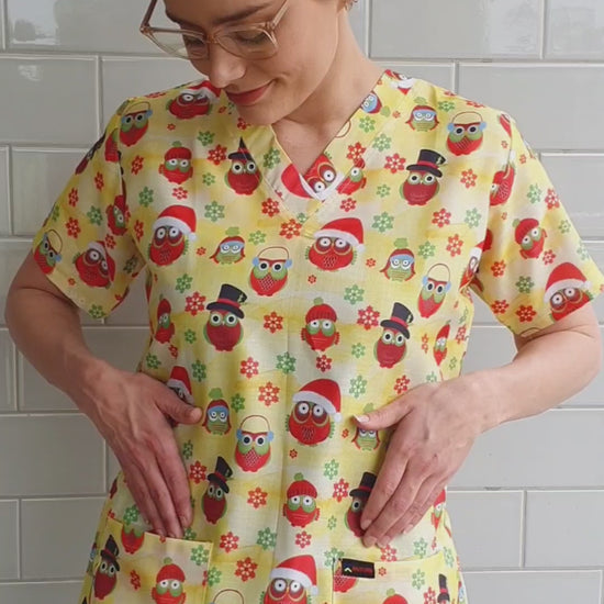 Cute owl printed Christmas medical uniform fun Scrub Top featuring a contemporary fit v neck with side slits.