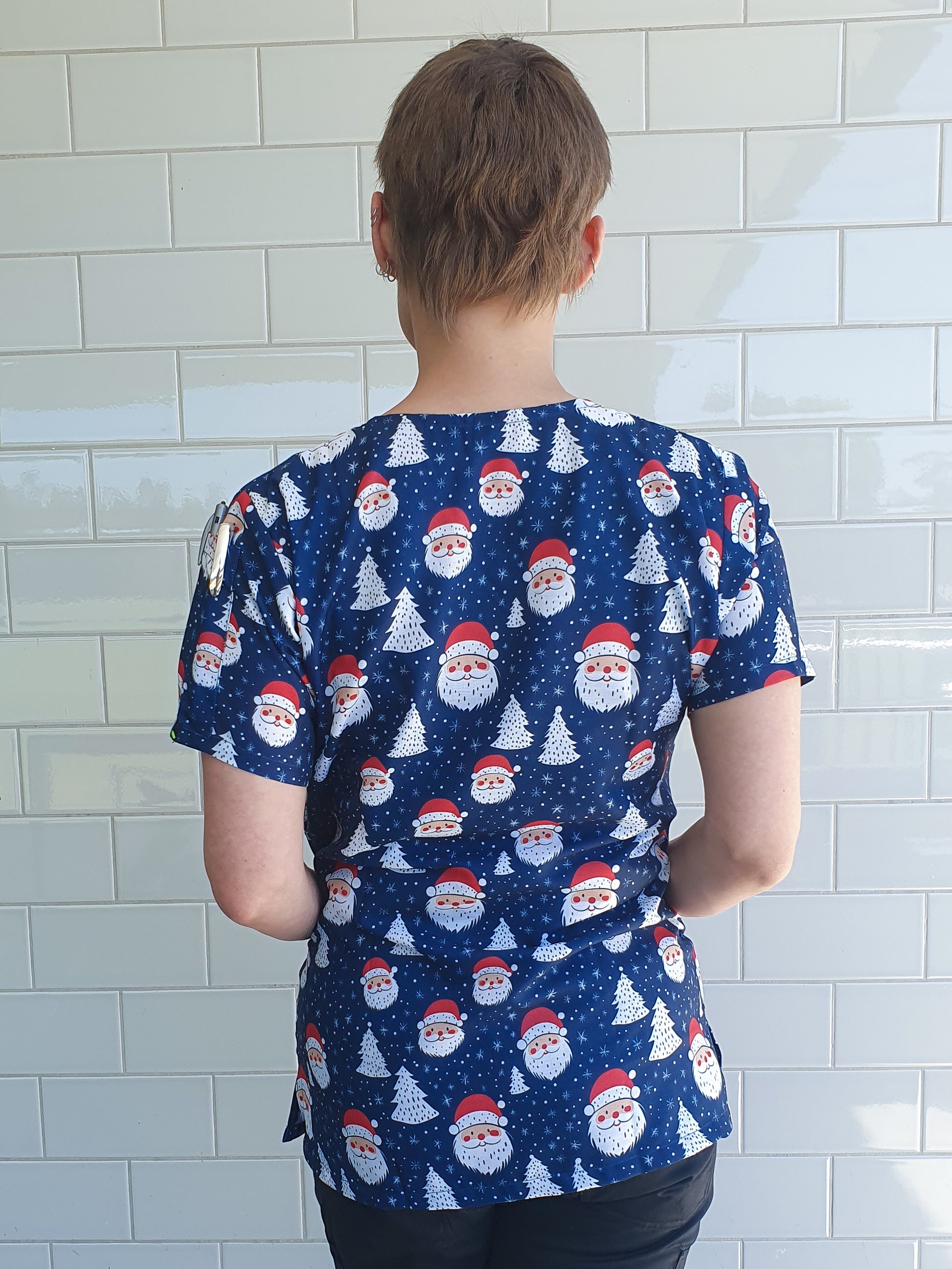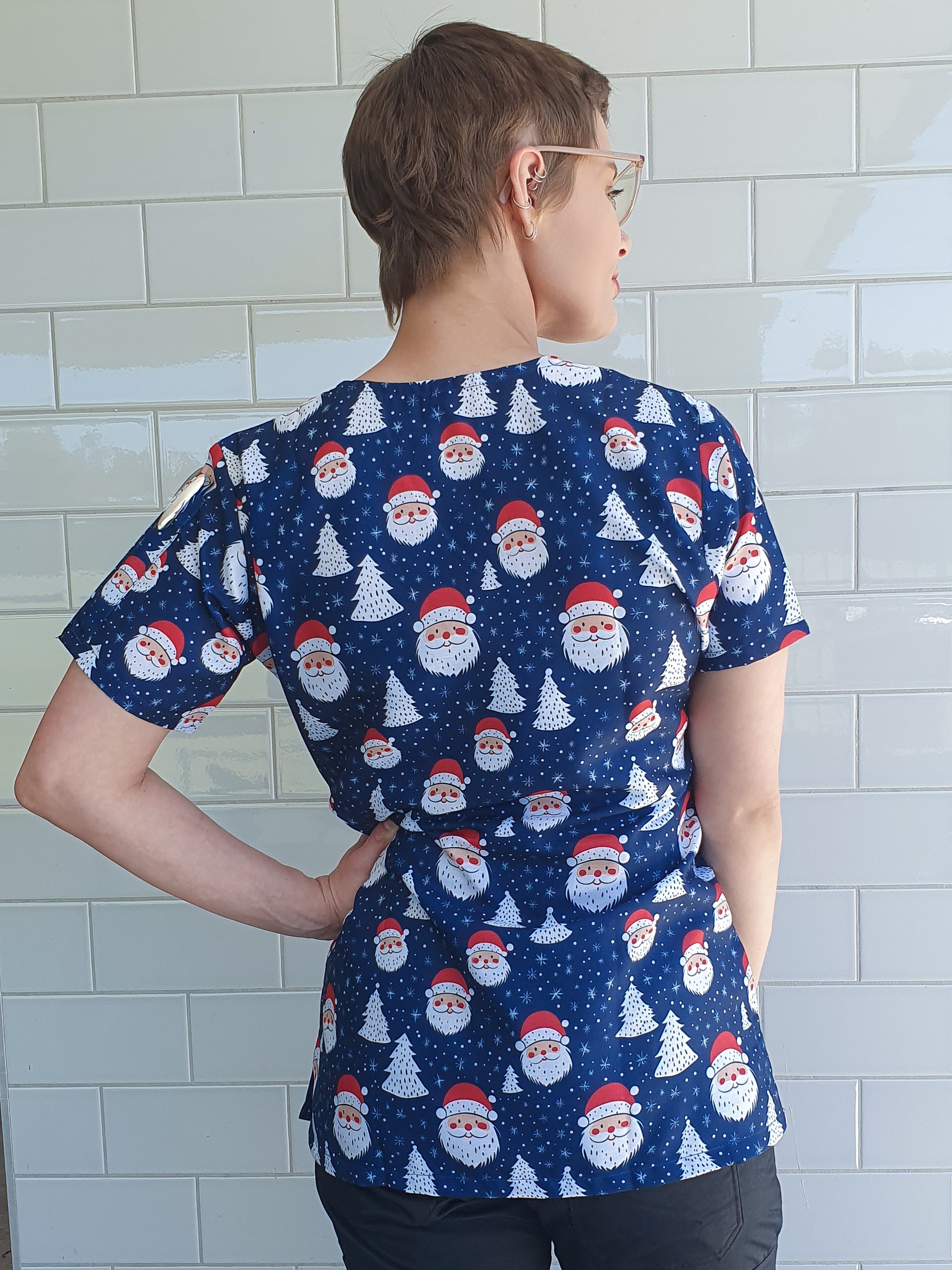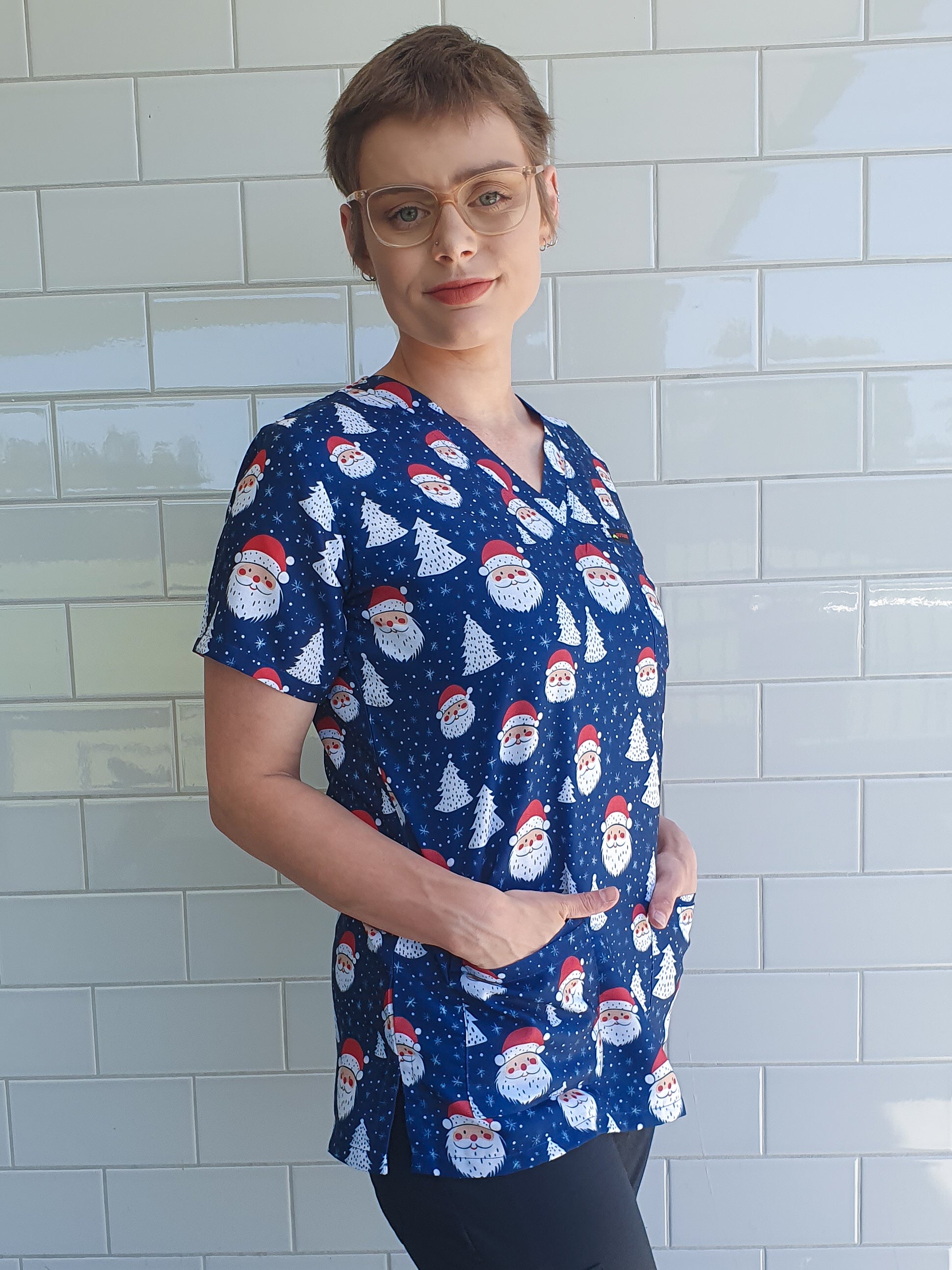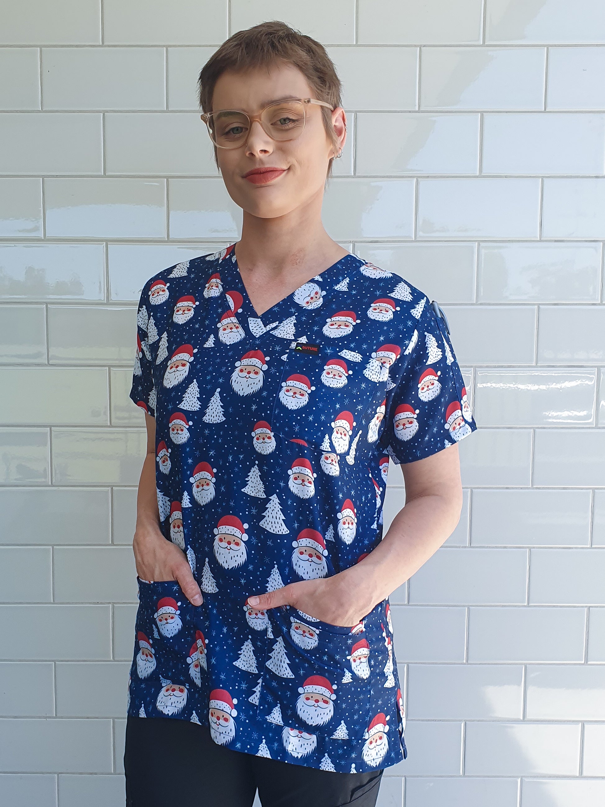 Santa print medical uniform fun Scrub Top featuring a contemporary fit v neck with side slits. This Christmas scrub top features 1 chest pocket and 2 lower hip patch pocket with internal compartment pockets to store all of your essentials .The top also has 2 Pen Pockets on Left Sleeve. This scrub top is made of Poly Cotton Fabric .