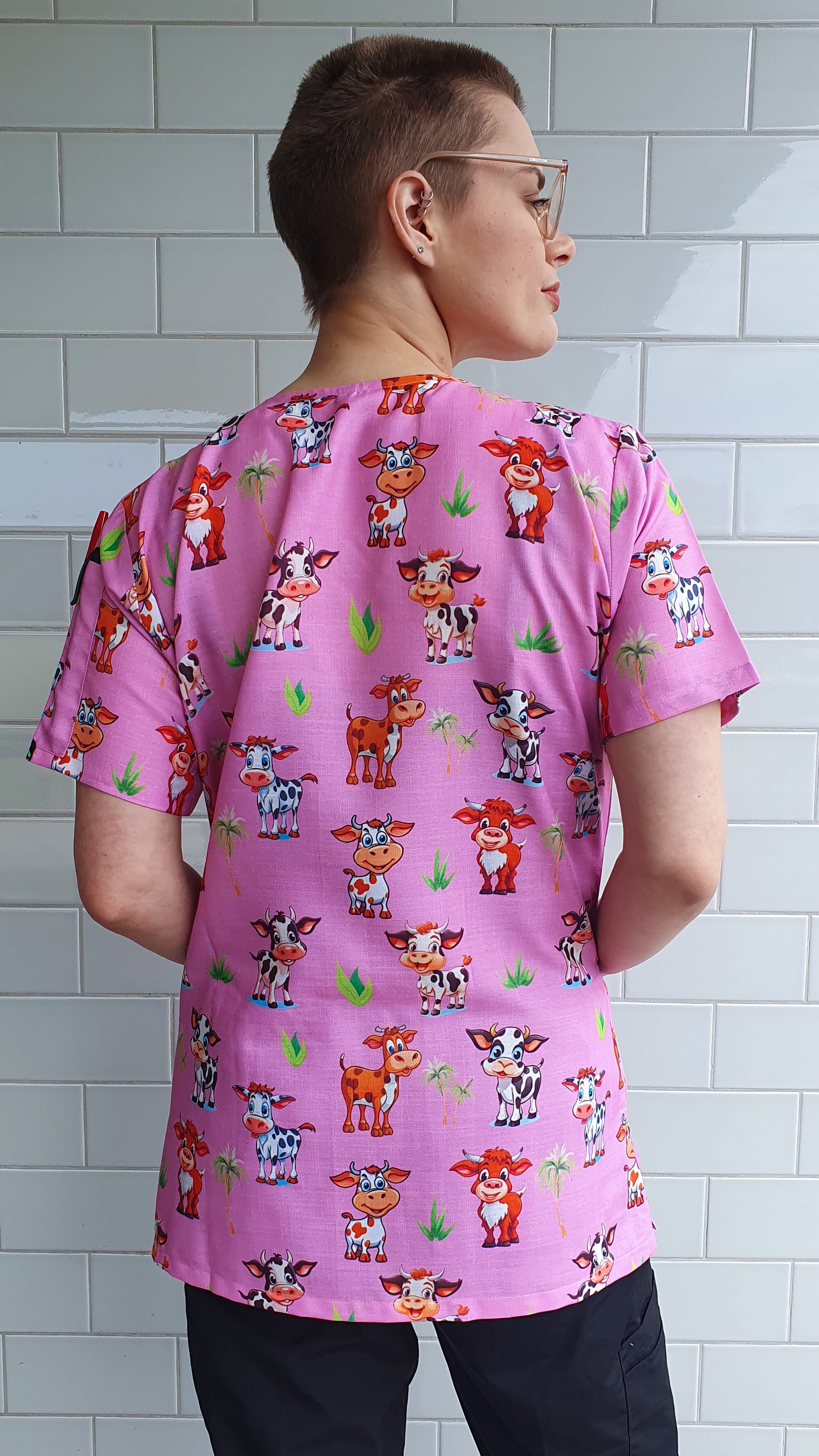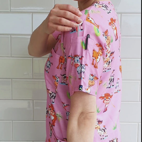 Smiling Cow With Green Trees Printed Fun Scrub Top Australia
