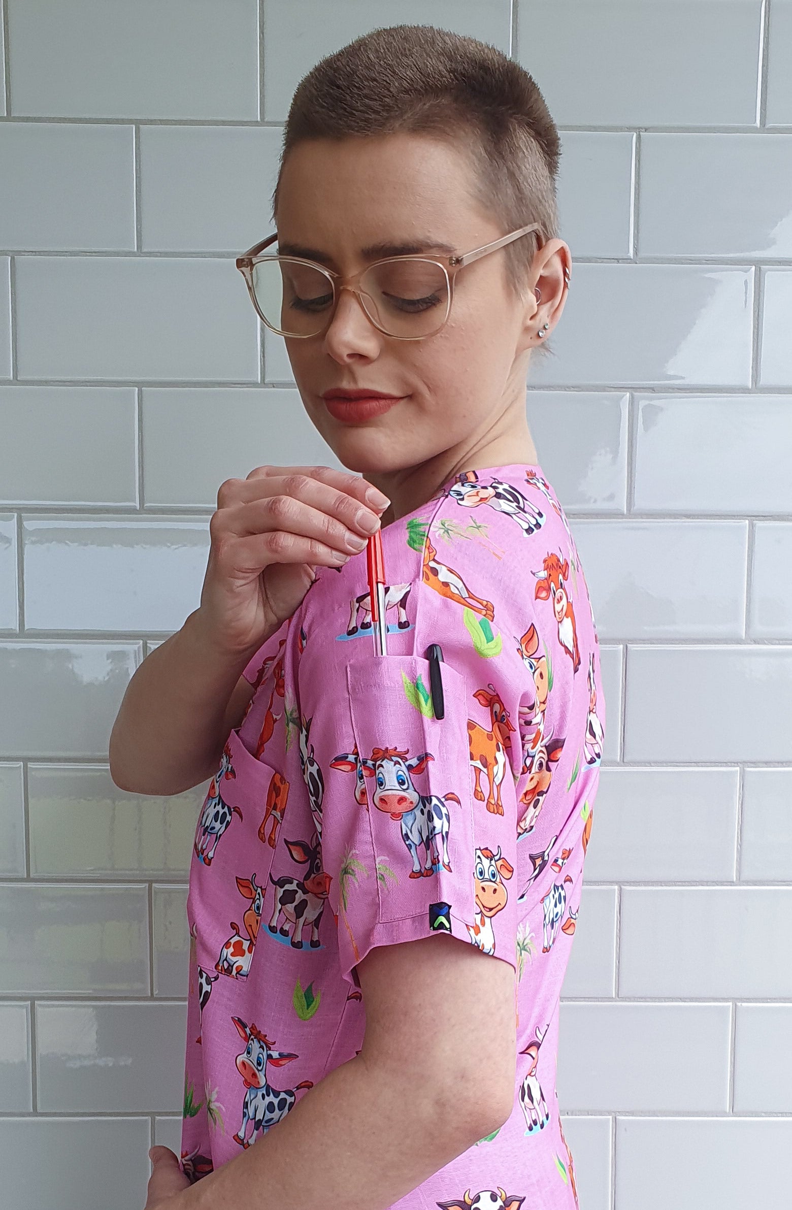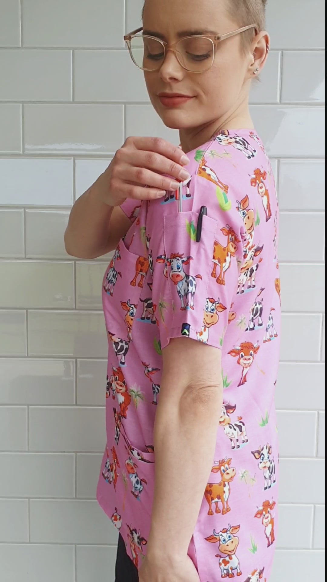 Cute smiling Cow V-Neck Printed Scrub Top featuring a contemporary fit v neck with side slits. The scrub top features 1 chest pocket and 2 lower hip patch pocket with internal compartment pockets to store all of your essentials .The top also has 2 Pen Pockets on Left Sleeve. This scrub is made of High Quality ,Soft, light weight polyester cotton ,giving throughout the year comfort.